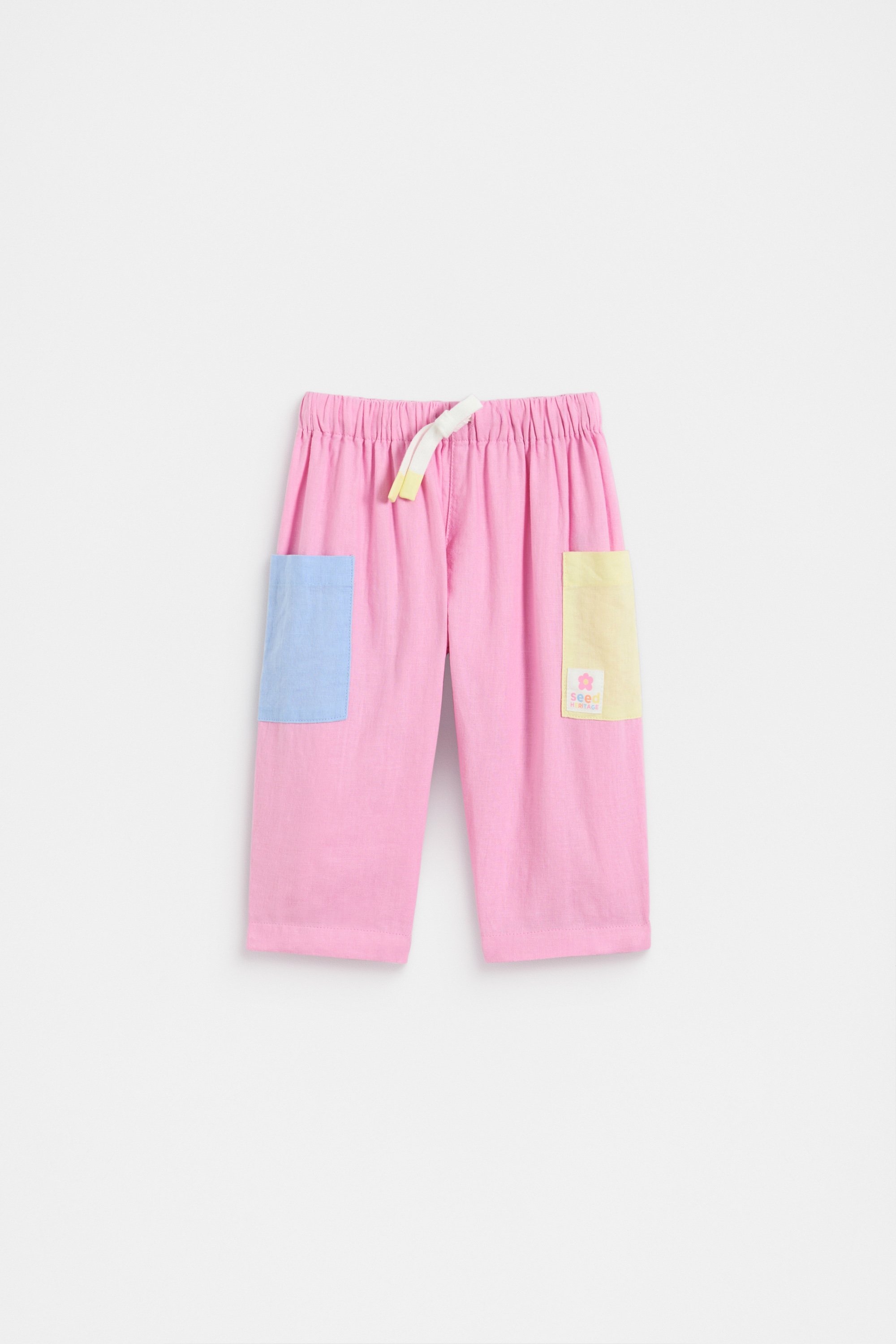 A handy style to build their little wardrobe, these pants are crafted in a lightweight blend containing linen. They have a comfortable elasticated waistband that secures with a drawstring and two patch pockets with a colourblock design.