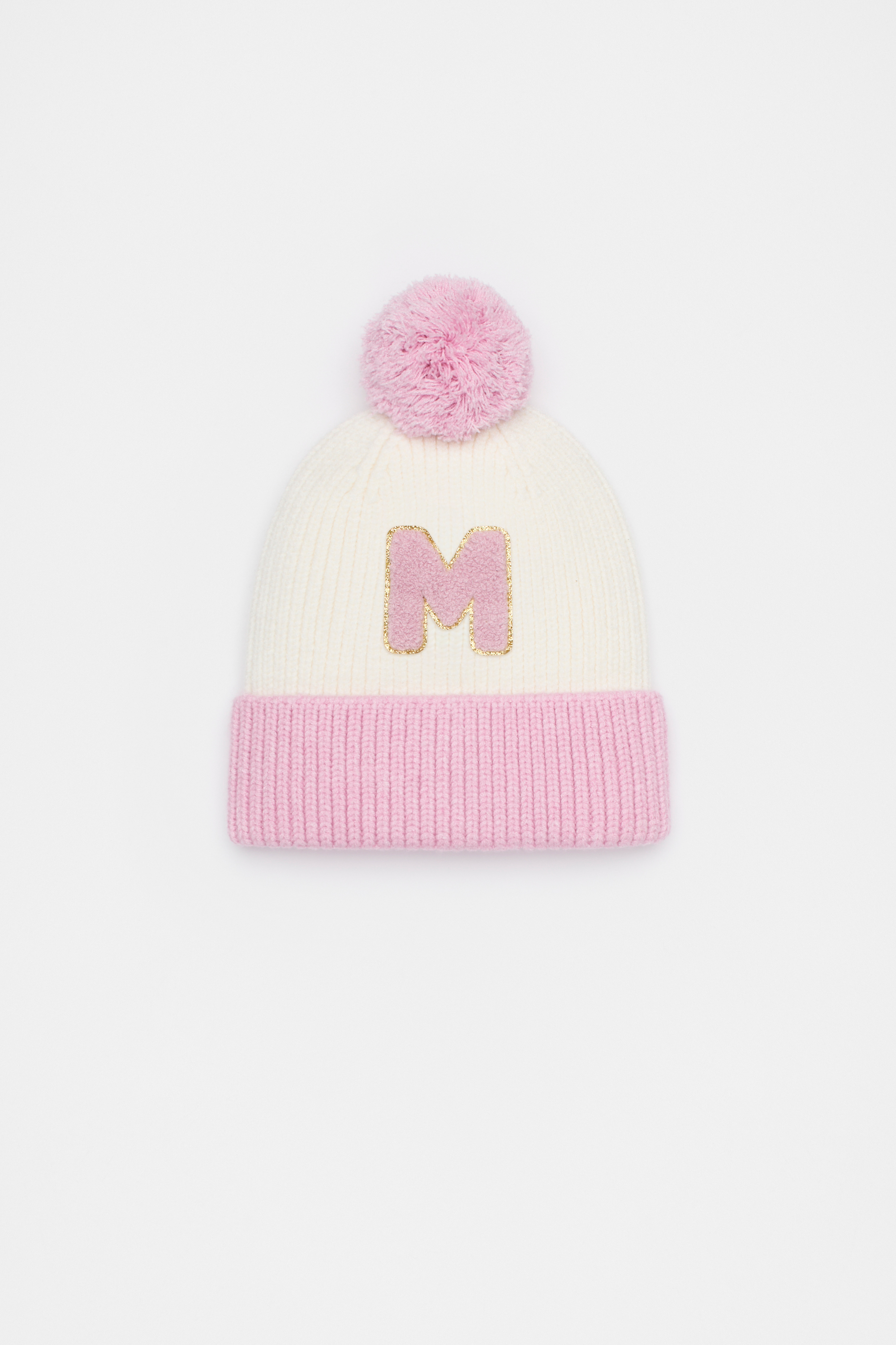 This adorable beanie has a ribbed hem for a comfortable fit. Featuring a cute pom pom, the contrast initial motif finished in gold glitter adds a personalised touch.