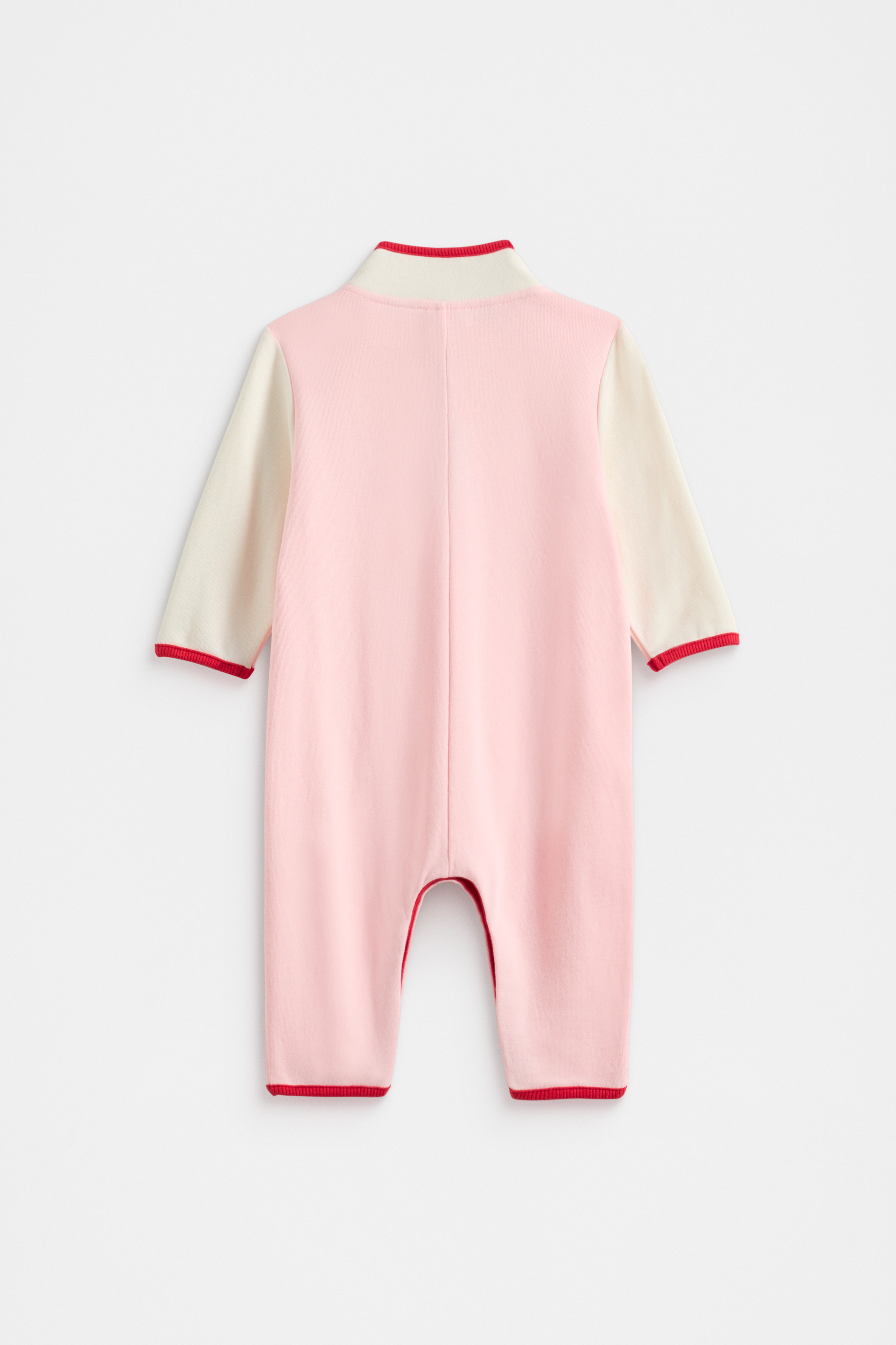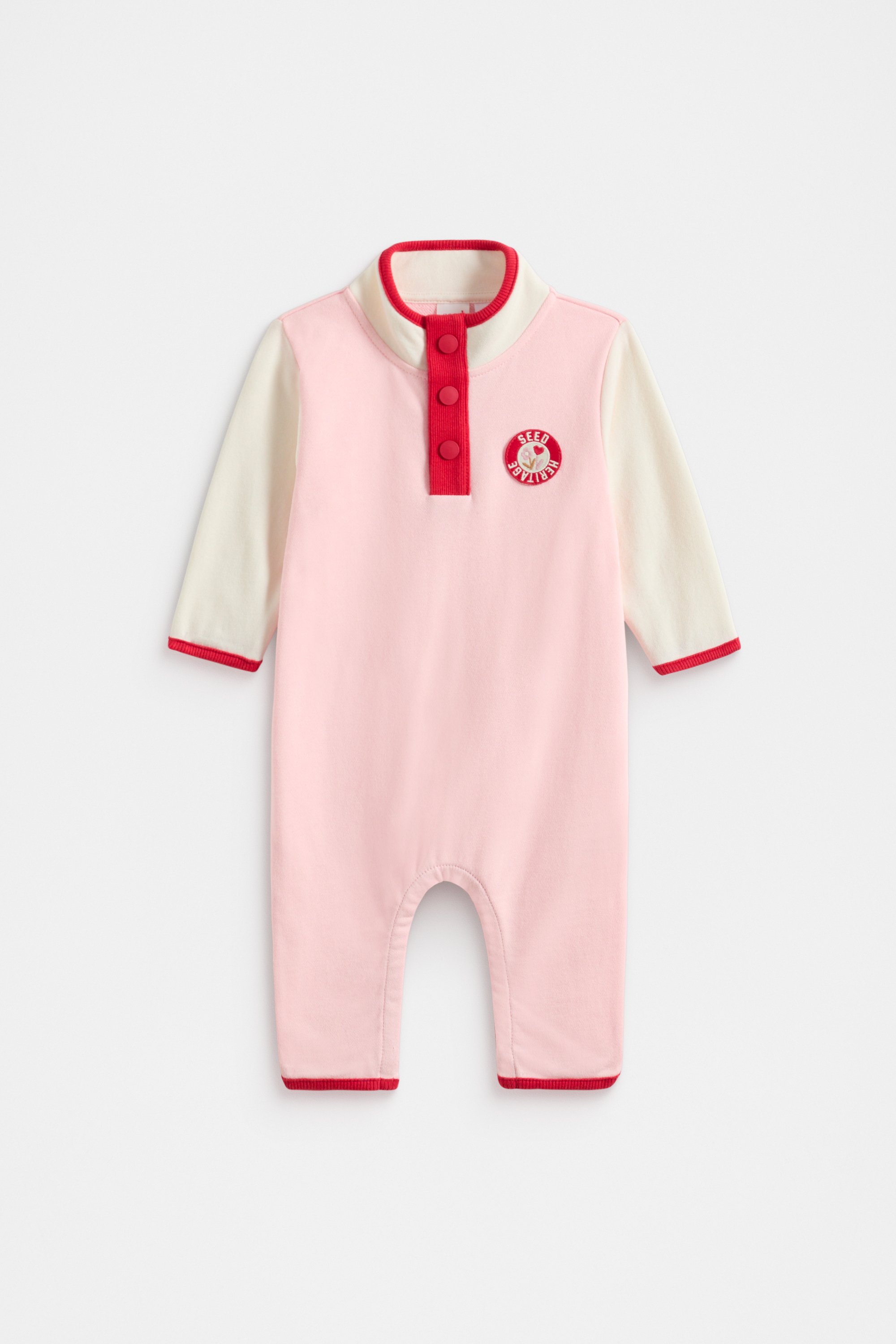 The cosiest design, this jumpsuit will make your little love cuddlier than ever. Crafted in premium cotton, this jumpsuit features a colourblock design with contrast sleeves and collar. It has a high collar with a button-up detail, gusset buttons and contrast trims. Designed as a mini racing suit, it features a playful embroidered patch with a too-cute flower design.