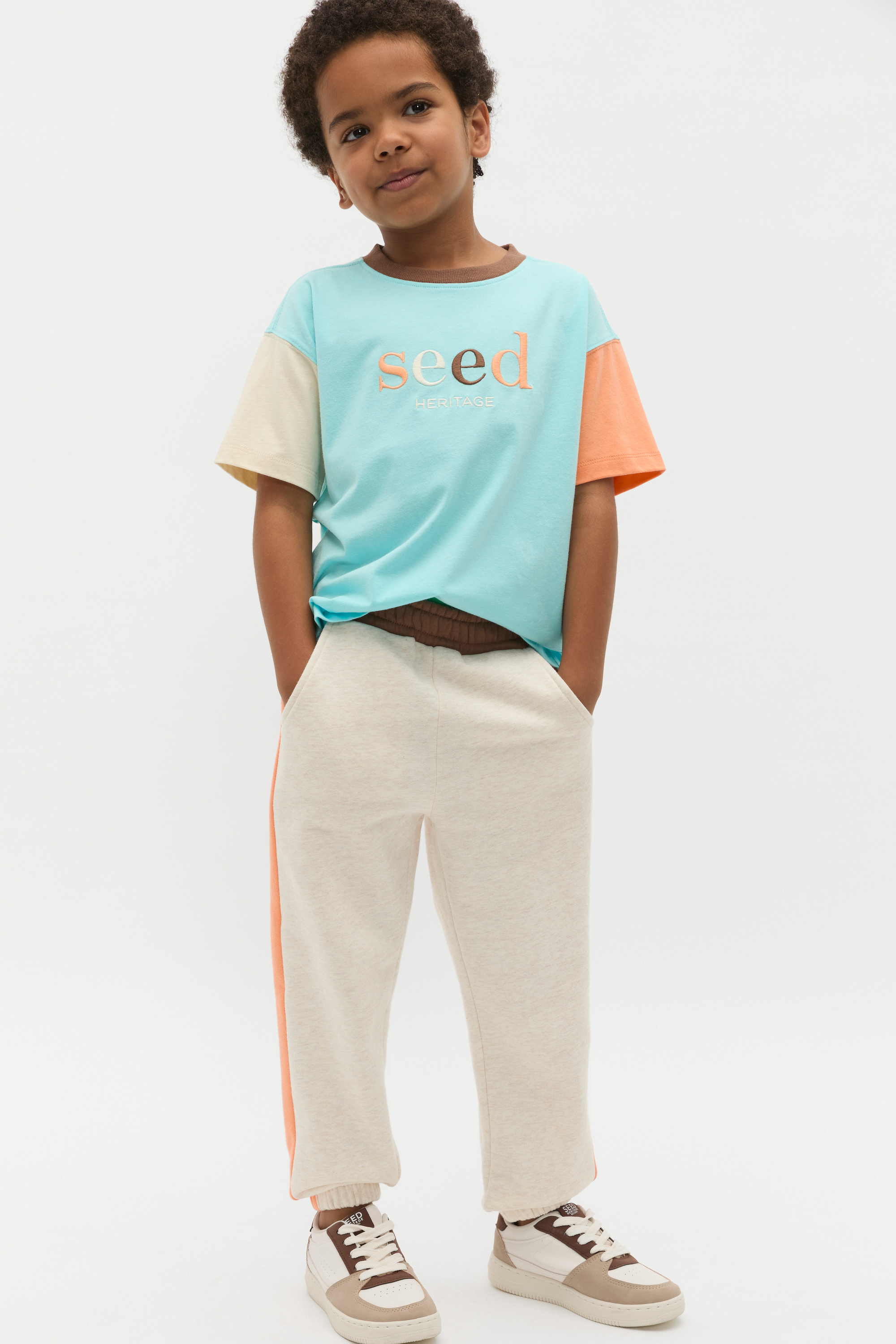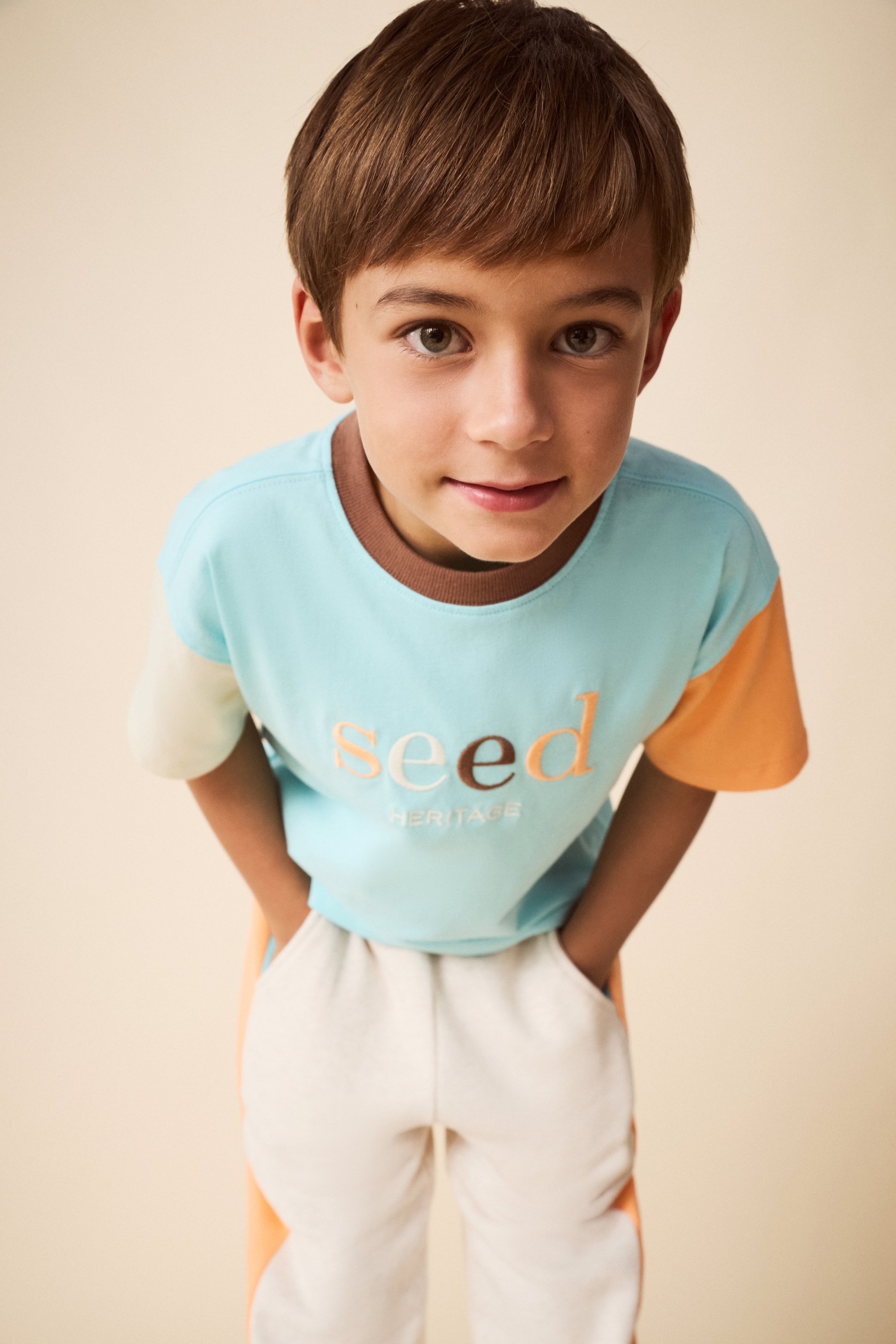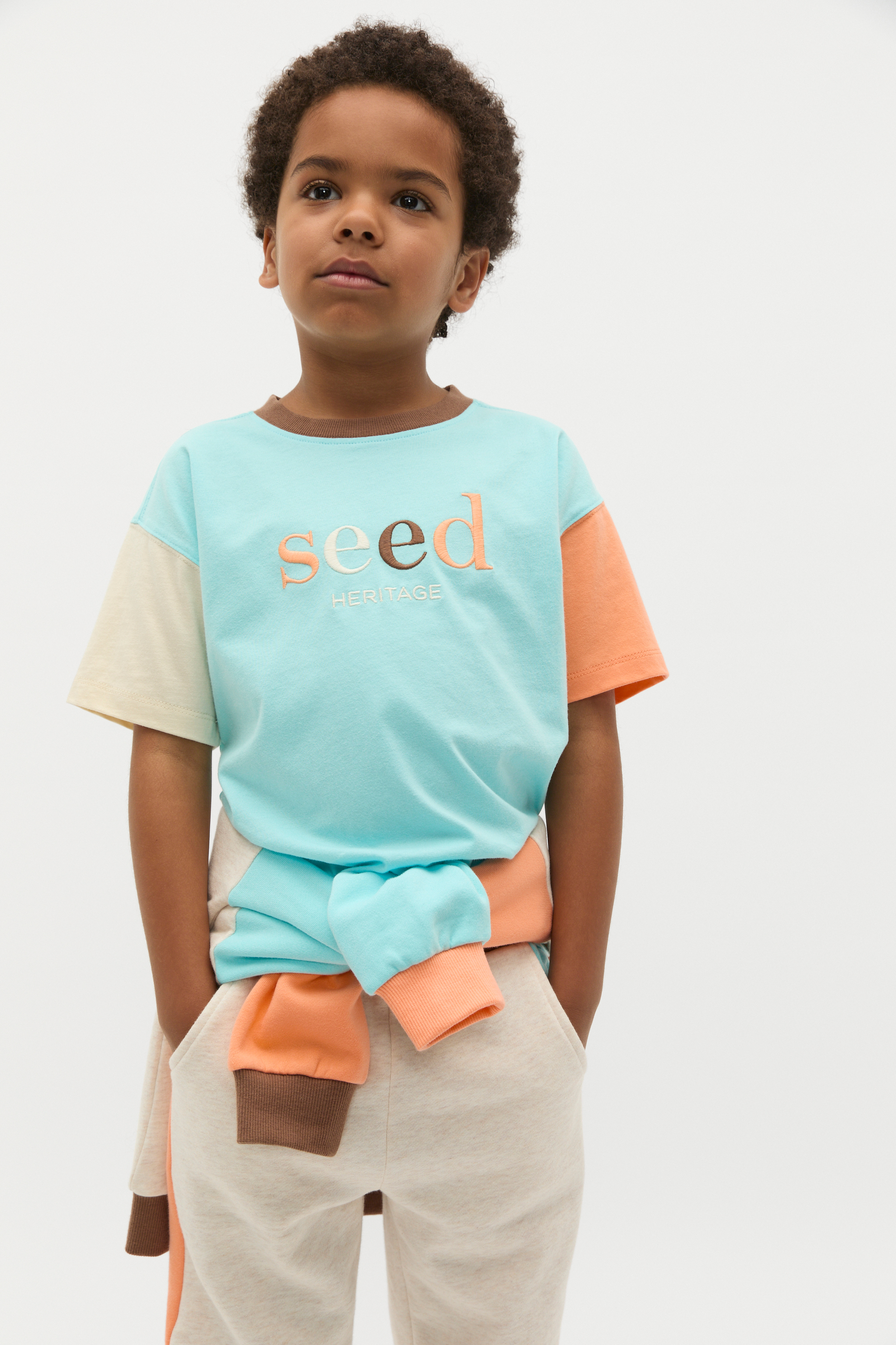 Playful and sweet, this tee is a favourite from our logo collection, ready for all-day play. Crafted in premium cotton, it features a round neck, short sleeves, an embroidered Seed Heritage logo and an always on-trend colourblock design.