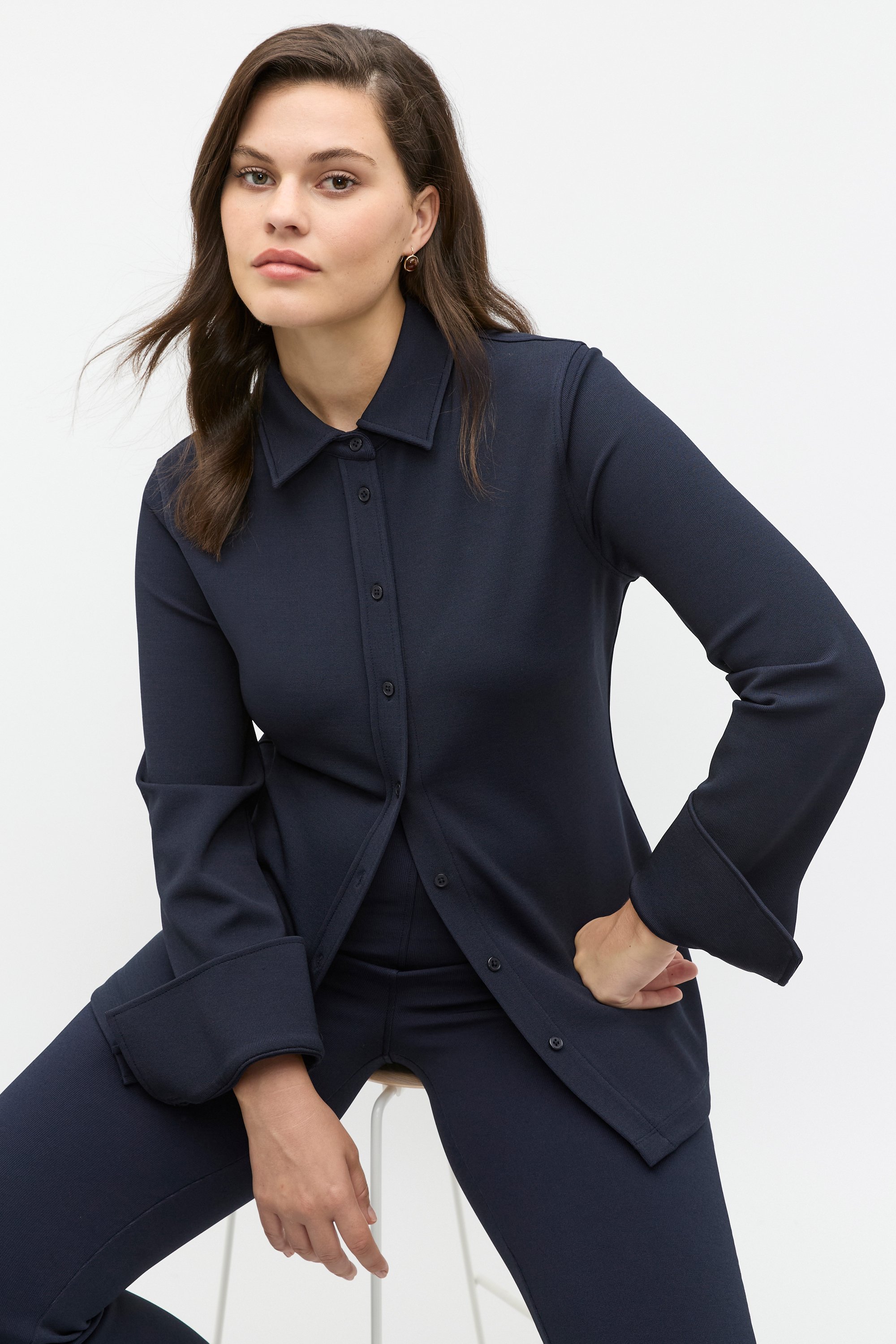 A simple design with a neat fit, this top is designed for everyday elegance. It features a collar, a button front, long sleeves with button cuffs and is finished in a smooth, stretchy blend.