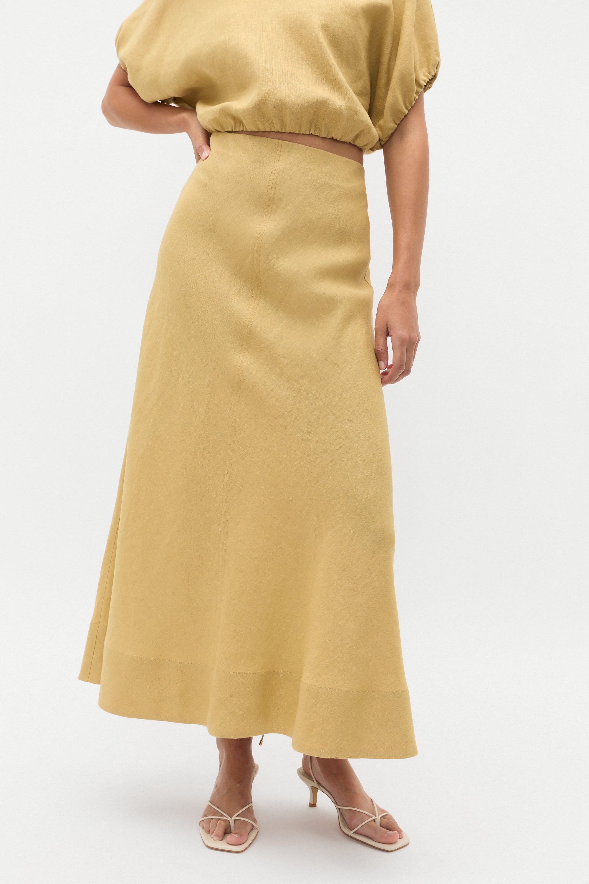 Simple and chic, this linen skirt adds a sophisticated touch to your day-to-day wardrobe. Crafted in premium linen, it features a fixed waistband, a front seam detail and a flowing A-line shape falling to a maxi length. Pair with the coordinating linen pieces for effortless tonal styling.