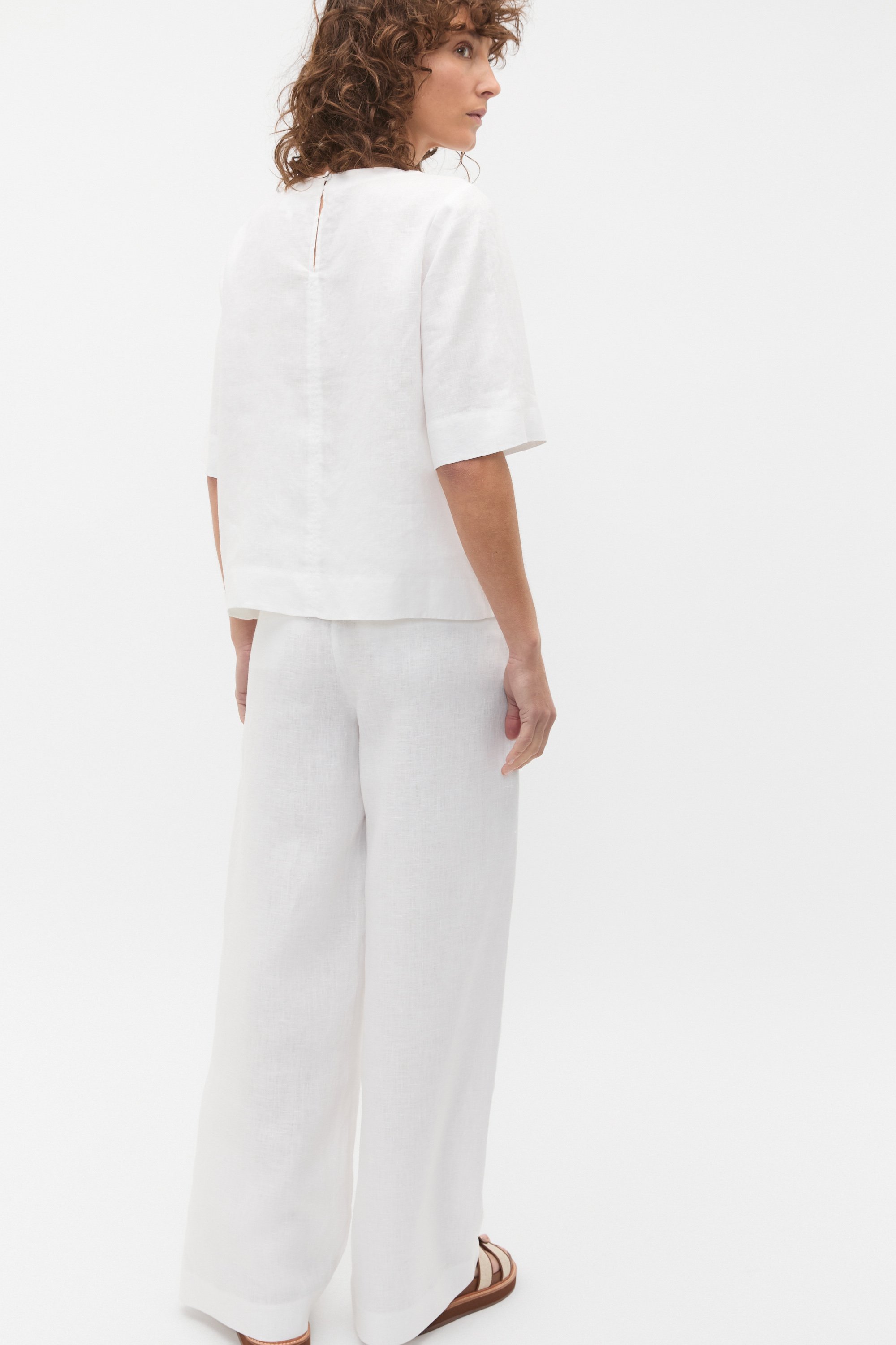 A premium essential in your everyday wardrobe, this tee is crafted in pure linen for an effortlessly elevated look. It features a round neck, short sleeves, a relaxed fit and secures with a button at the back of the neck. Style with the coordinating linen pieces for a chic tonal set, or pair with your favourite jeans for your day-to-day casual.