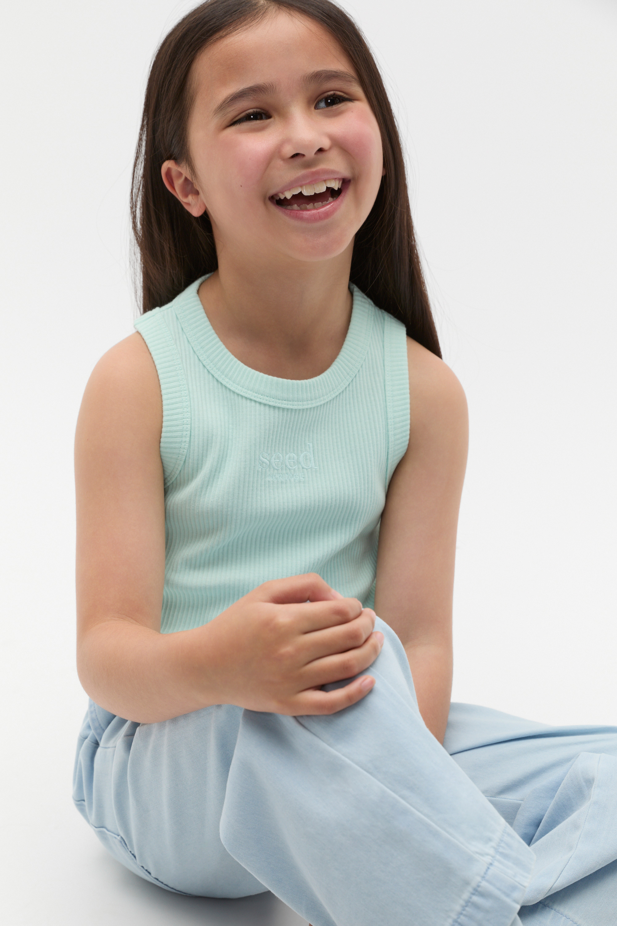 This comfortable rib tank is one she'll wear on repeat. Crafted in a cotton rich blend with a little stretch, it features a round neck, a sleeveless shape and an embroidered Seed Heritage logo.