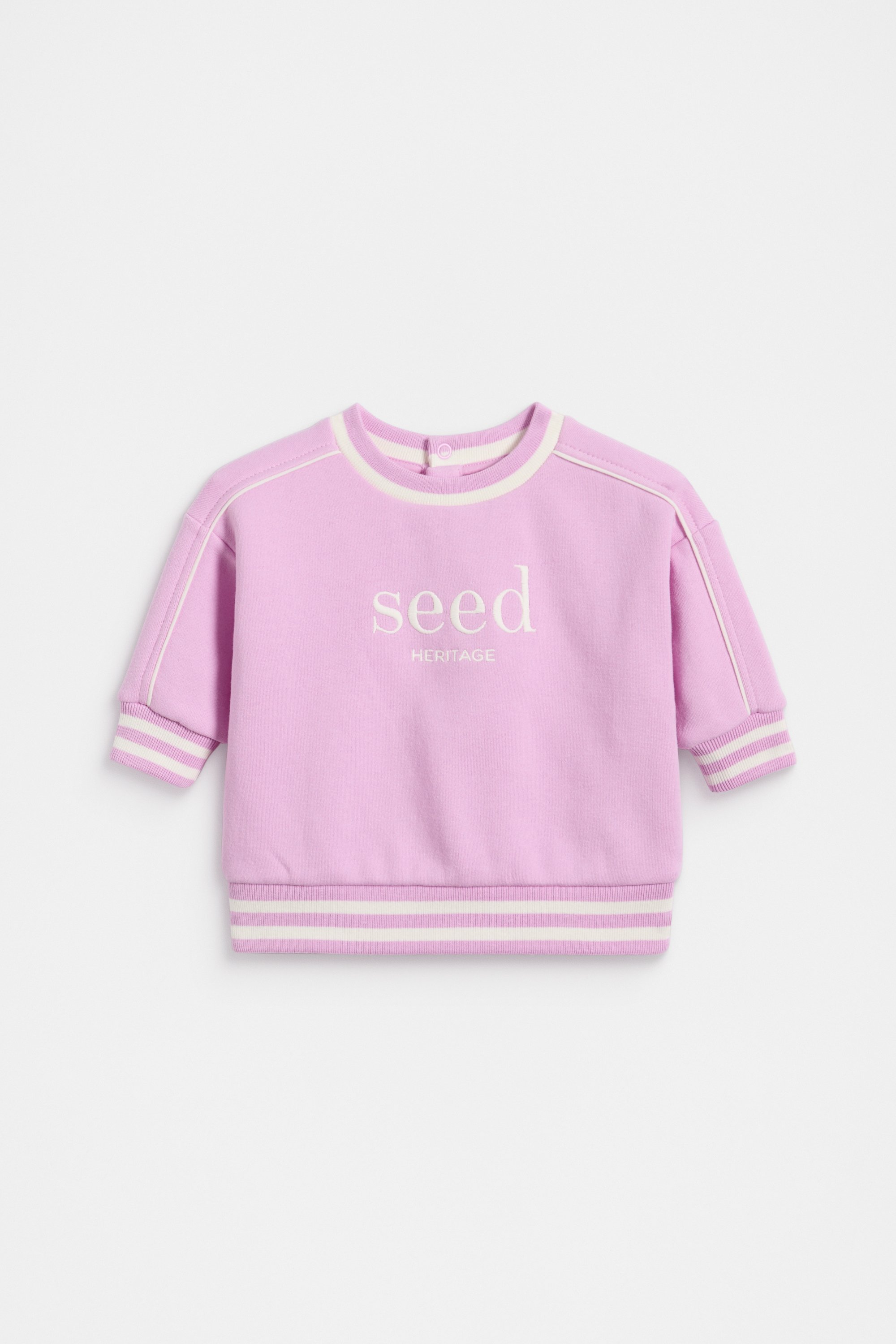A classic from our logo collection, this sweater is a sweet layer for your little one. Crafted in premium cotton, it features a round neck, long sleeves, an embroidered Seed Heritage logo and contrast stripe details. It secures with buttons at the back of the neck.
