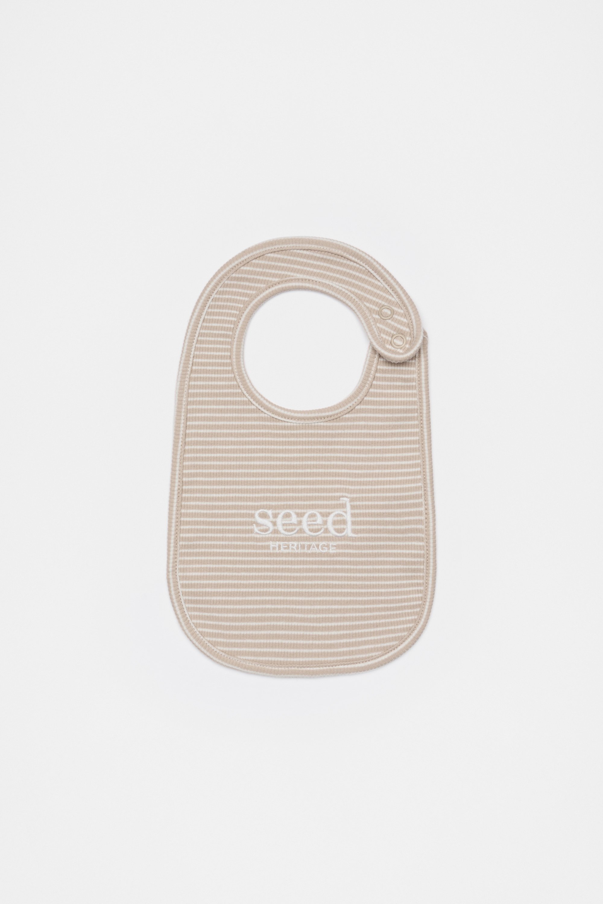 This classic bib features an embroidered Seed Heritage logo, a stripe pattern, and a rib texture. Crafted from soft stretch cotton, the bib has snap fastenings at the neck for easy changes.