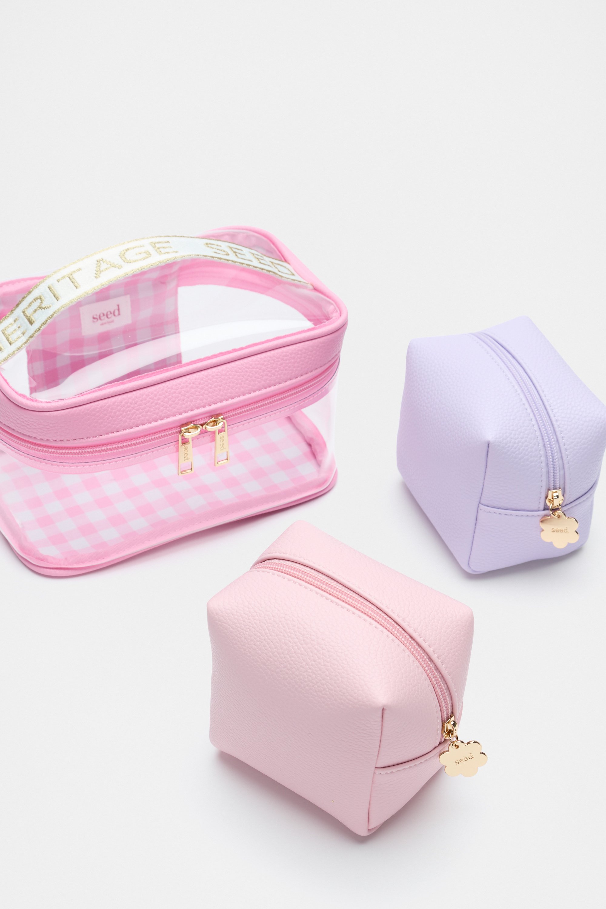 Practical and cute, this set includes three different cosmetic bags and makes the perfect gift. It features a large transparent case with a clear and gingham design, a two-way zip around closure and an easy carry handle. Inside fits two smaller cases, one pink and one purple.