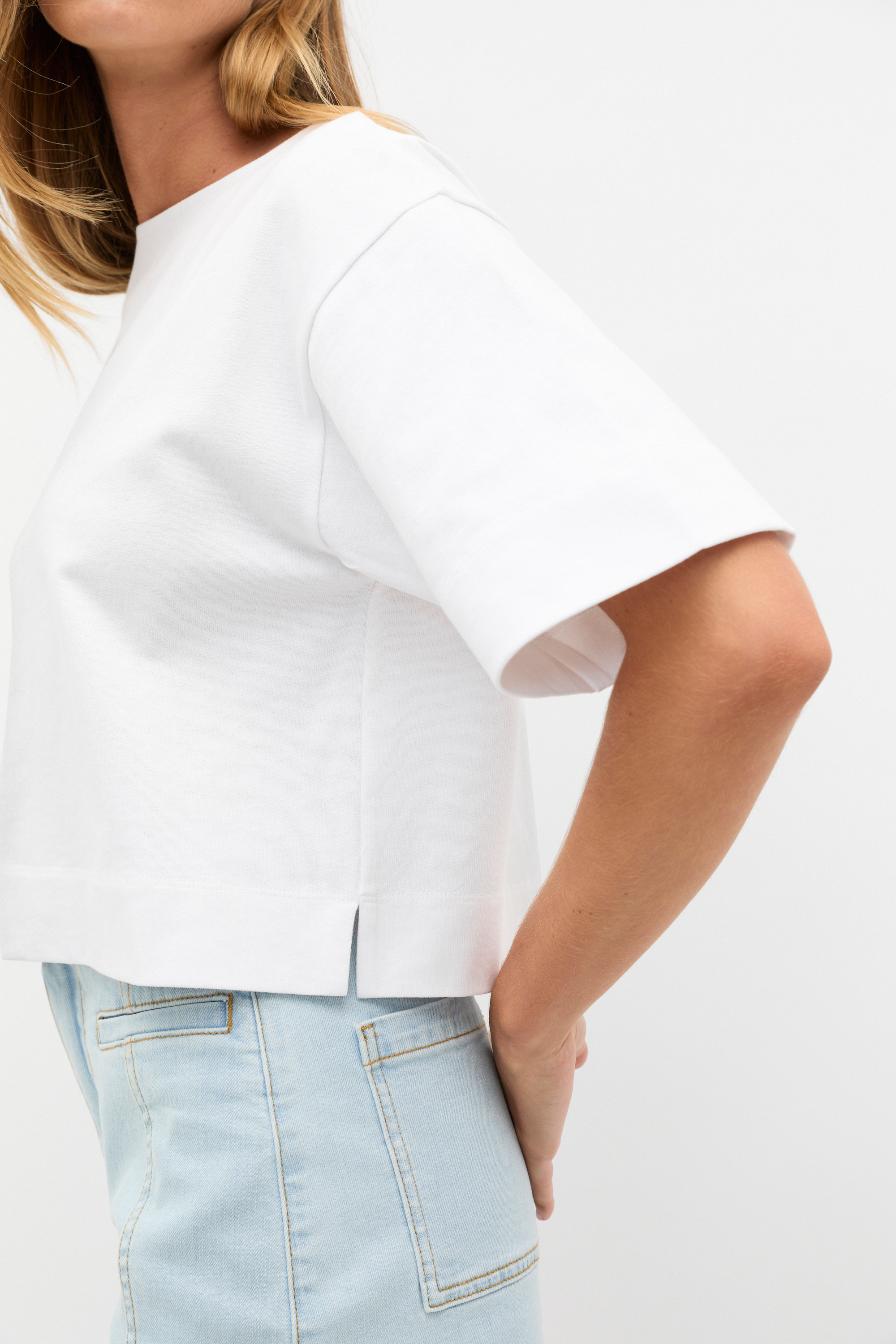 The perfect go-to tee, this style is set to become a new staple in your casual wardrobe. Crafted in premium cotton with a little stretch, it features a round neck, short sleeves, a comfortable boxy fit and a split hem.