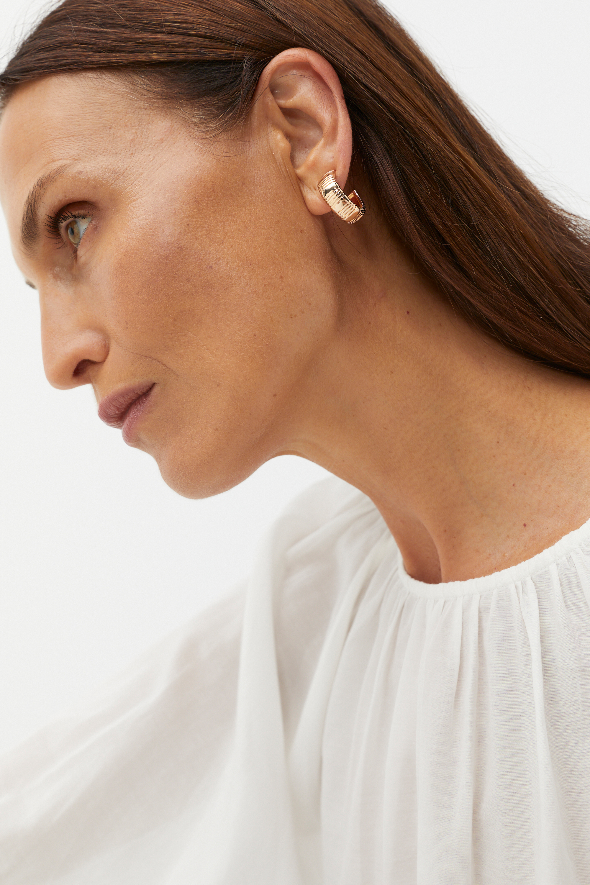 A simple style with an elegant finish, these hoops are an ideal style for your accessories refresh. They feature creased details and are available in silver or gold for versatile styling. Pair with the matching ring for a curated look.