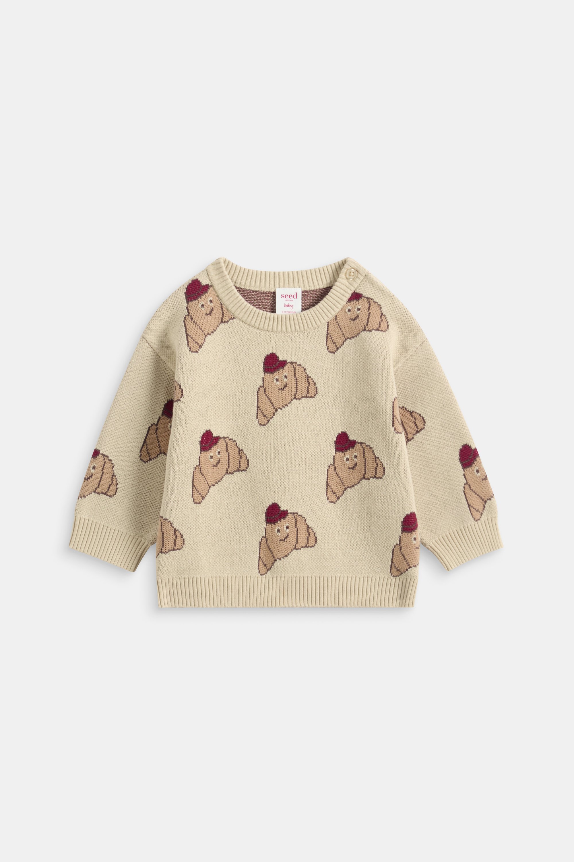 Adorably detailed with a croissant design, this little jumper is sweet as can be. Crafted in premium cotton with a soft knit finish, it features a round neck, long sleeves and a button at the shoulder for ease when changing.