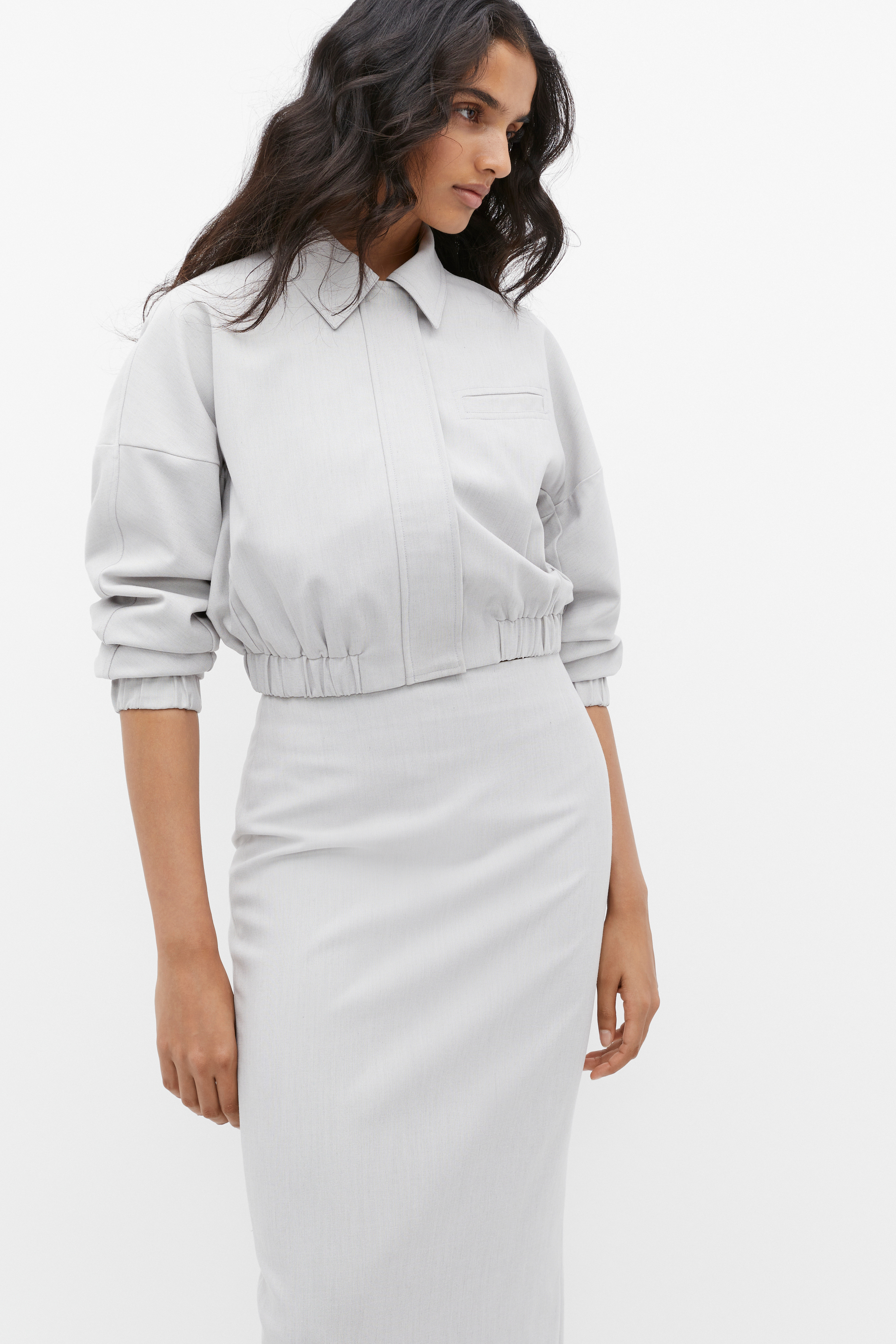 Your next statement jacket option, this bomber jacket is perfect for pairing with high-waisted pants and skirts. It features a collar, a concealed zip closure with snaps at either end, an angled pocket, dropped shoulders, and elasticated trims. In a chic cropped length, it can be worn with the matching pencil skirt for a modern coord.