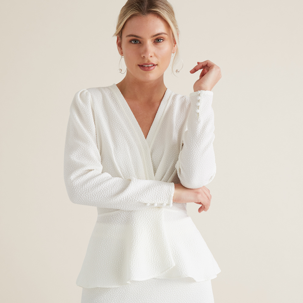 Crafted from a textural finish, this Cross Front Blouse boasts luxury. Featuring a plunging V neckline, it is detailed with long balloon sleeves, gathered centre and peplum hem. Pare back with a matching Seed co-ord skirt to complete the effortless day-to-night ensemble. For your reference, our model is 177 cm and wears a size 8. For care instructions, check the label inside of the garment.