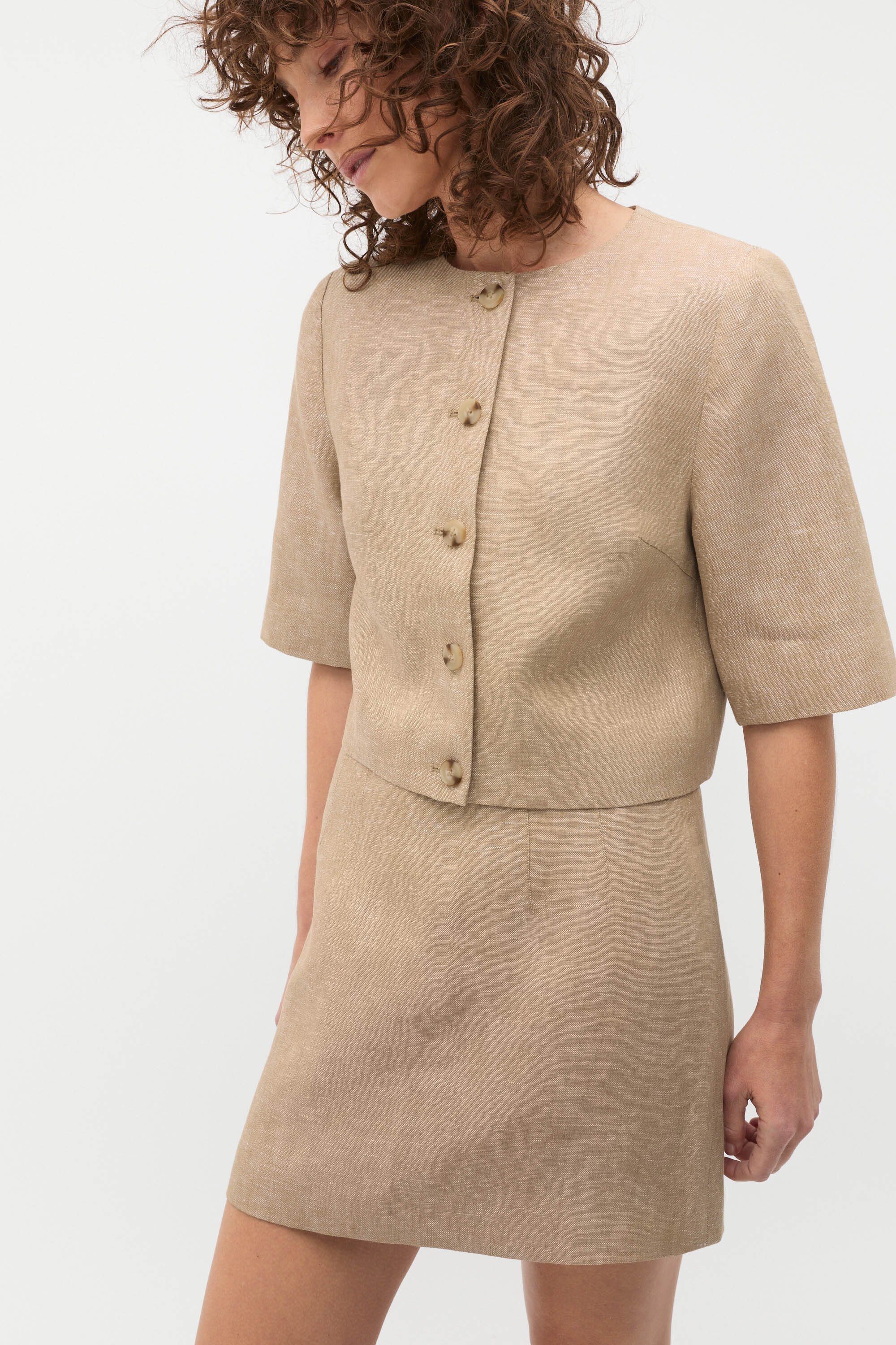 Structured and elevated, this crossdye style is a chic option for your warm-weather getaways. Crafted in premium linen, it features a round neck, half sleeves and a button-through front. It's fully lined for comfort and wearability and with a cropped length, it offers an effortlessly on-trend look.