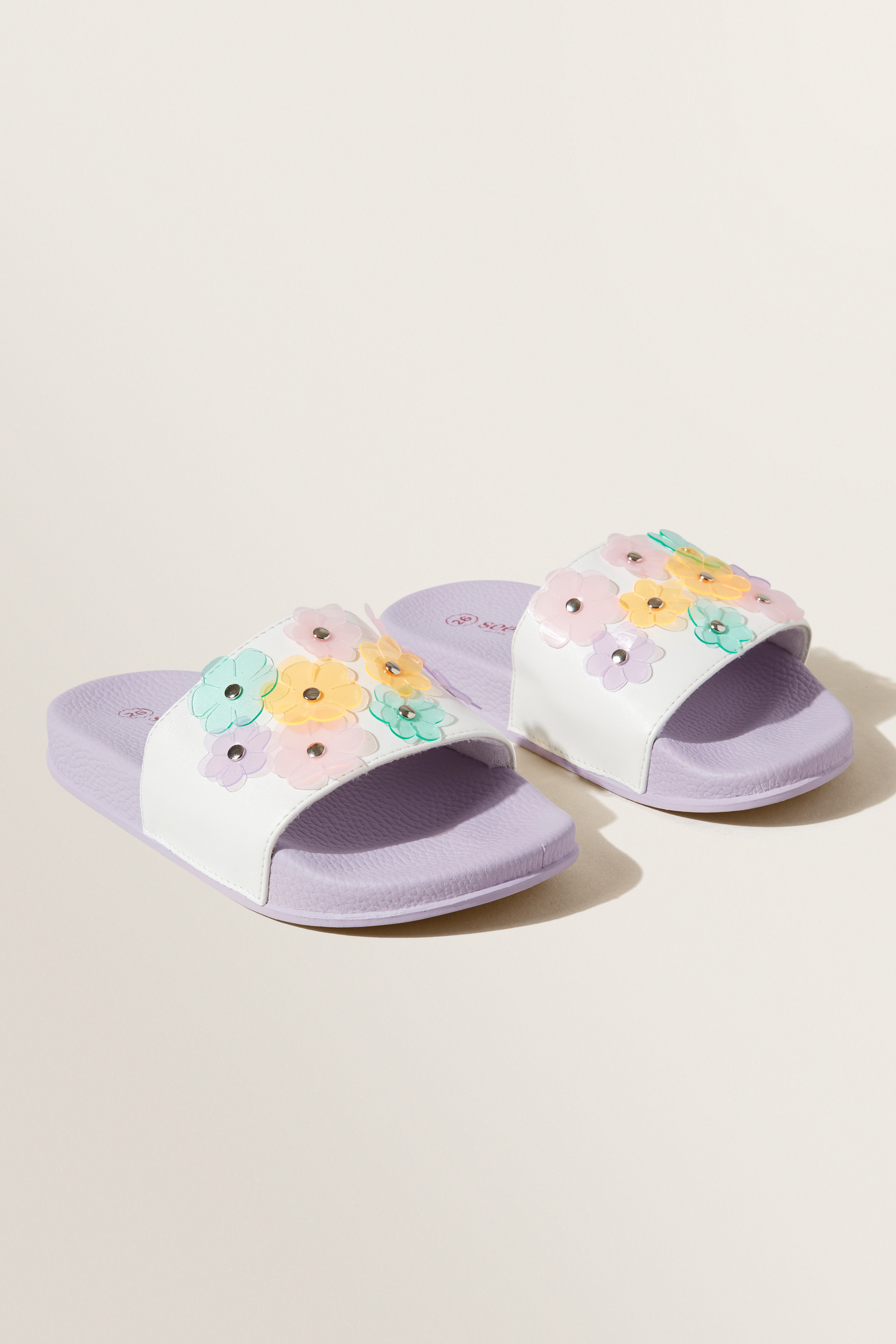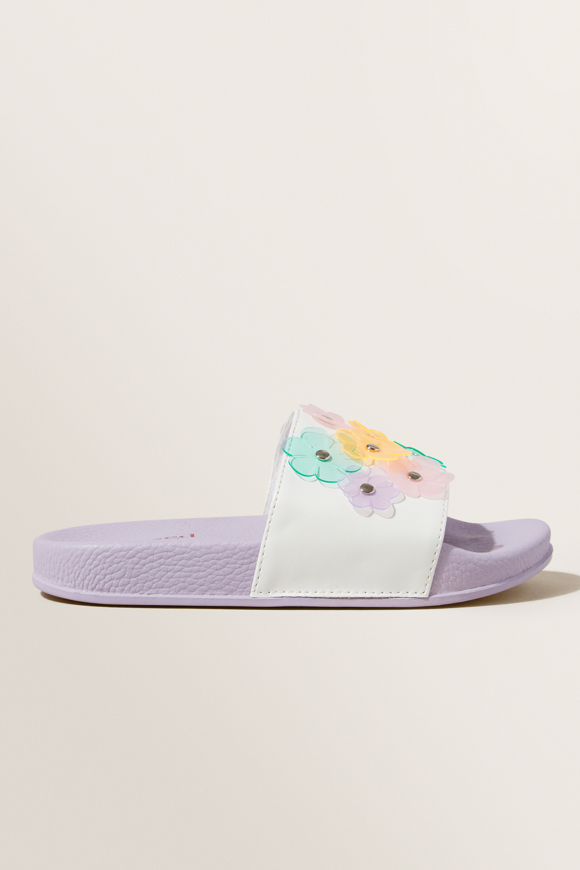 Colourful daisies decorate these slip-on slides, perfect for lazy summer days. The violet slides have a contrasting white strap, and a soft rubber sole.