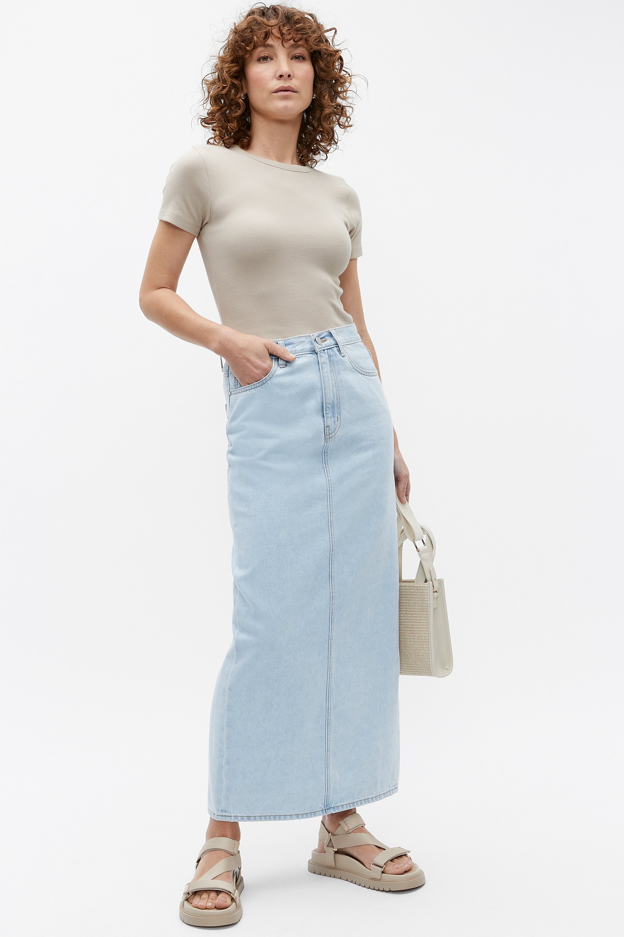 On-trend with plenty of styling options, this midi skirt is crafted from classic non-stretch denim. It's a five-pocket style with a fixed waistband, a button and zip closure, and a column shape with a rear hem split for movement. By choosing our cotton products you're supporting our investment in Better Cotton's mission. This product was sourced via a system of mass balance and therefore may not contain Better Cotton.