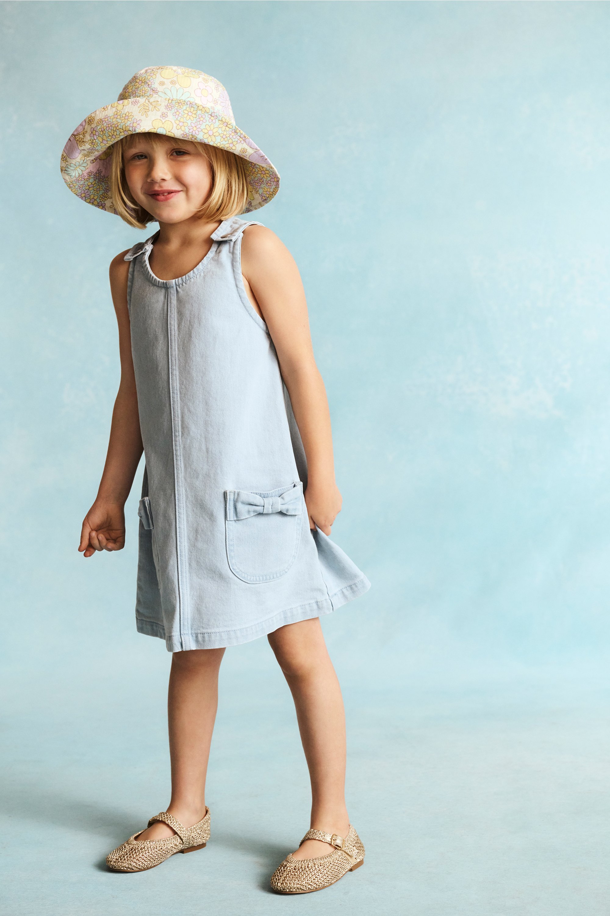 An essential for her weekend wardrobe, this denim pinafore is perfect to layer or style alone in the warmer weather. Crafted in premium cotton, it's a sleeveless style that secures with press stud buttons and features two front pockets with statement bows.