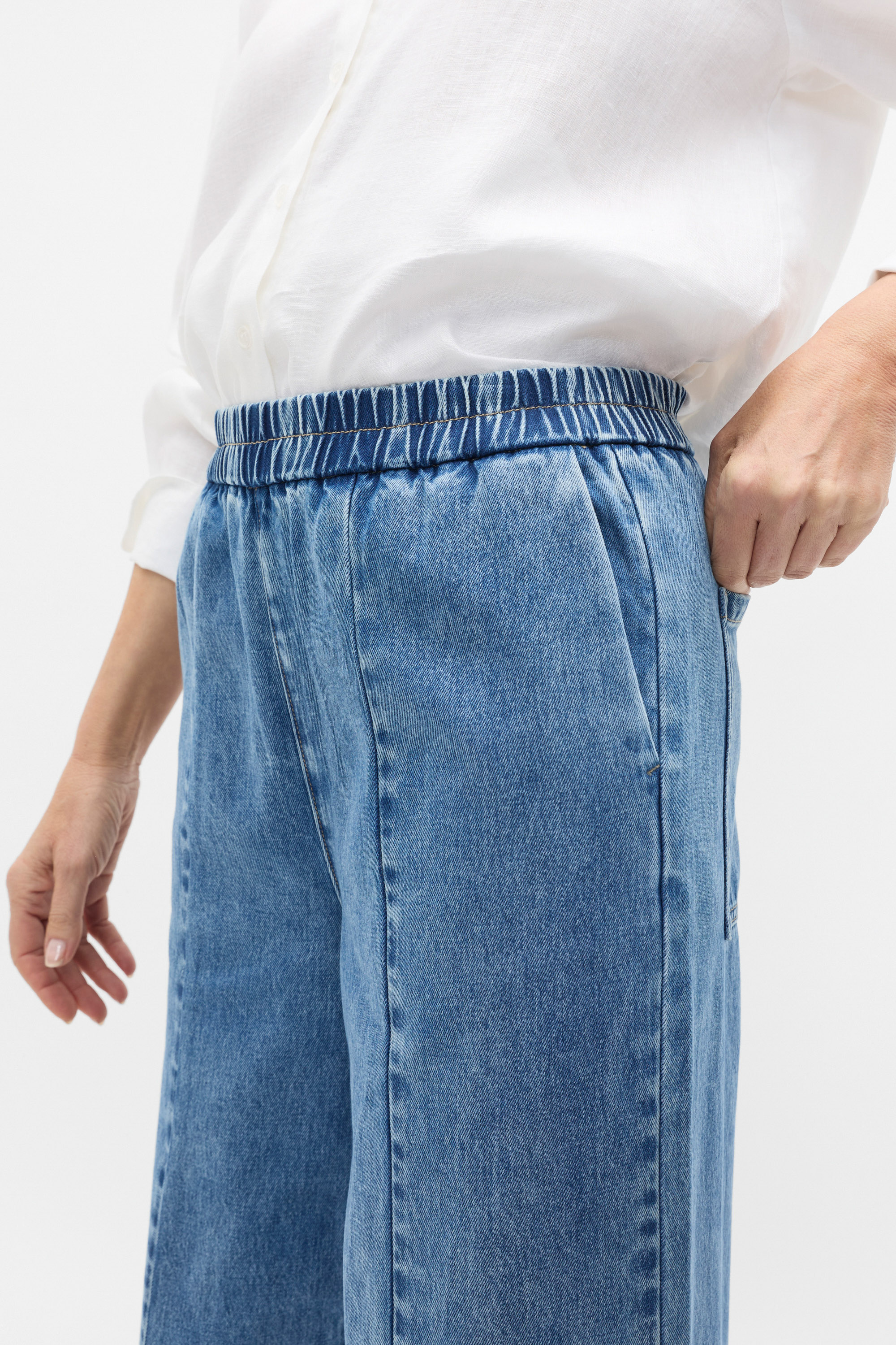 Comfortably chic, these pull-on jeans are a handy addition to your everyday styling. Crafted in premium cotton, they feature an elasticated waistband, pockets and a wide leg shape. By choosing our cotton products you're supporting our investment in Better Cotton's mission. This product was sourced via a system of mass balance and therefore may not contain Better Cotton.