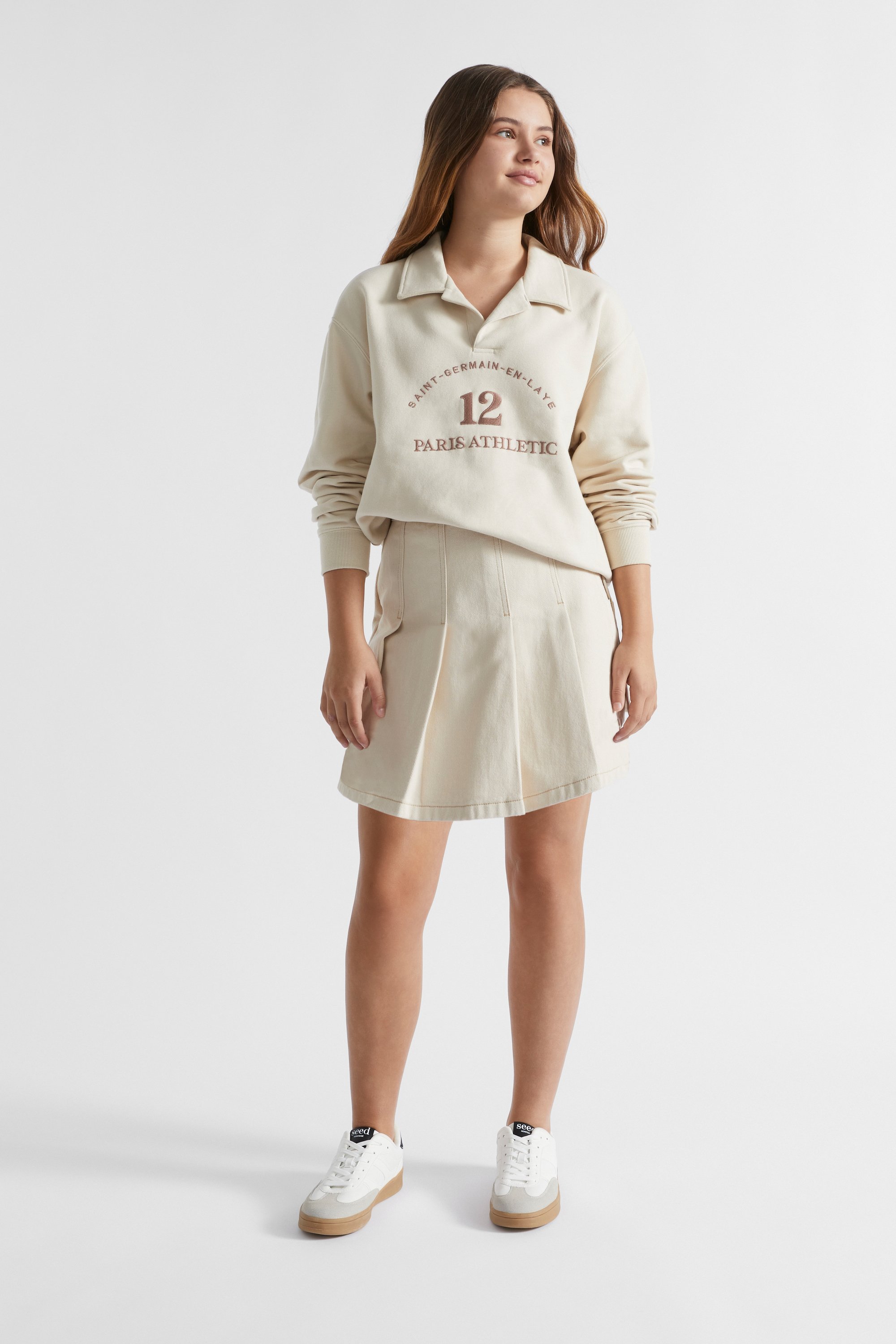 Crafted from classic rigid denim, this skort is bound to be her new go-to. It features a wrap design with an external button and an internal button and zip fly, pleats at the front, and internal shorts.