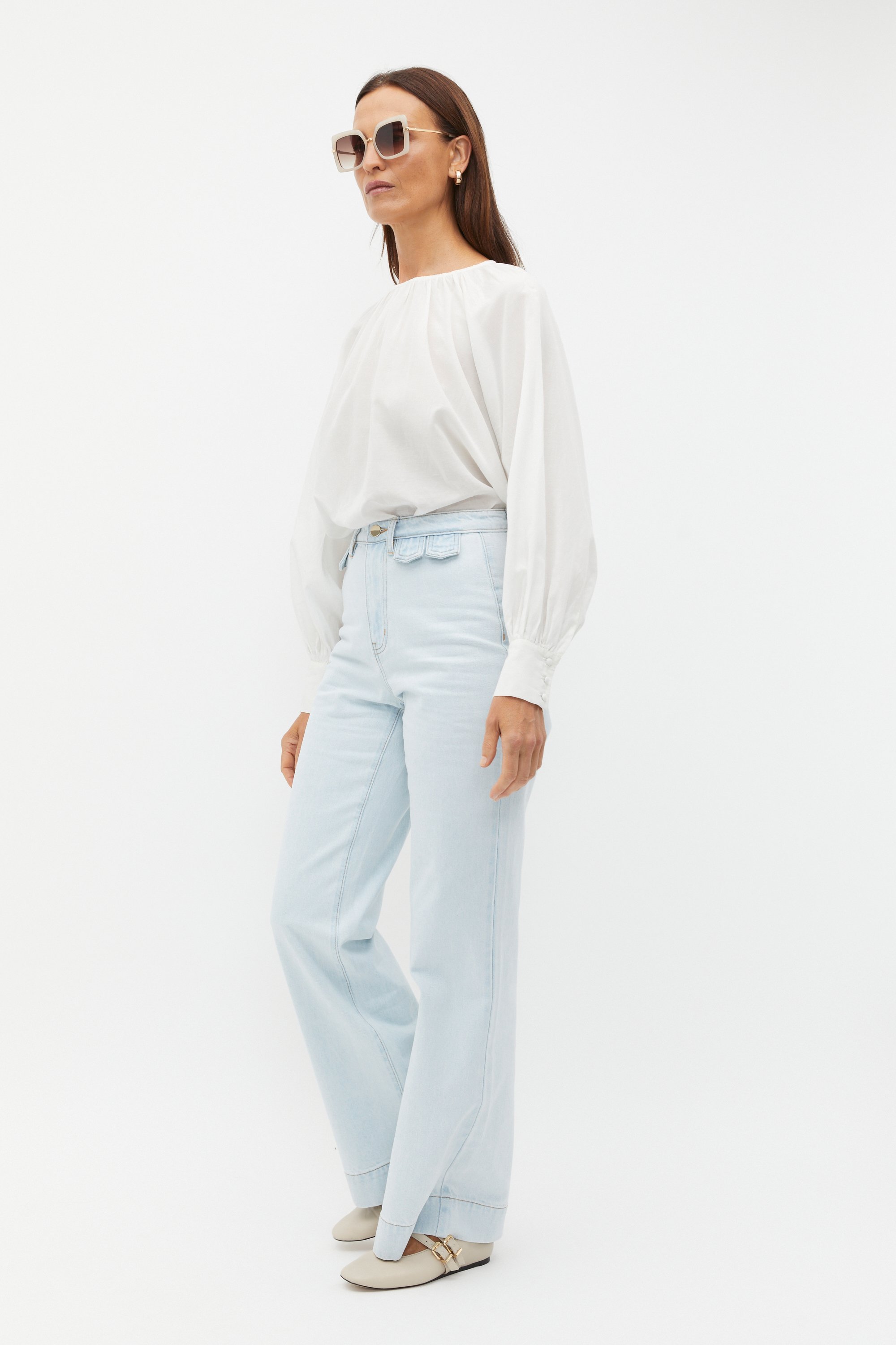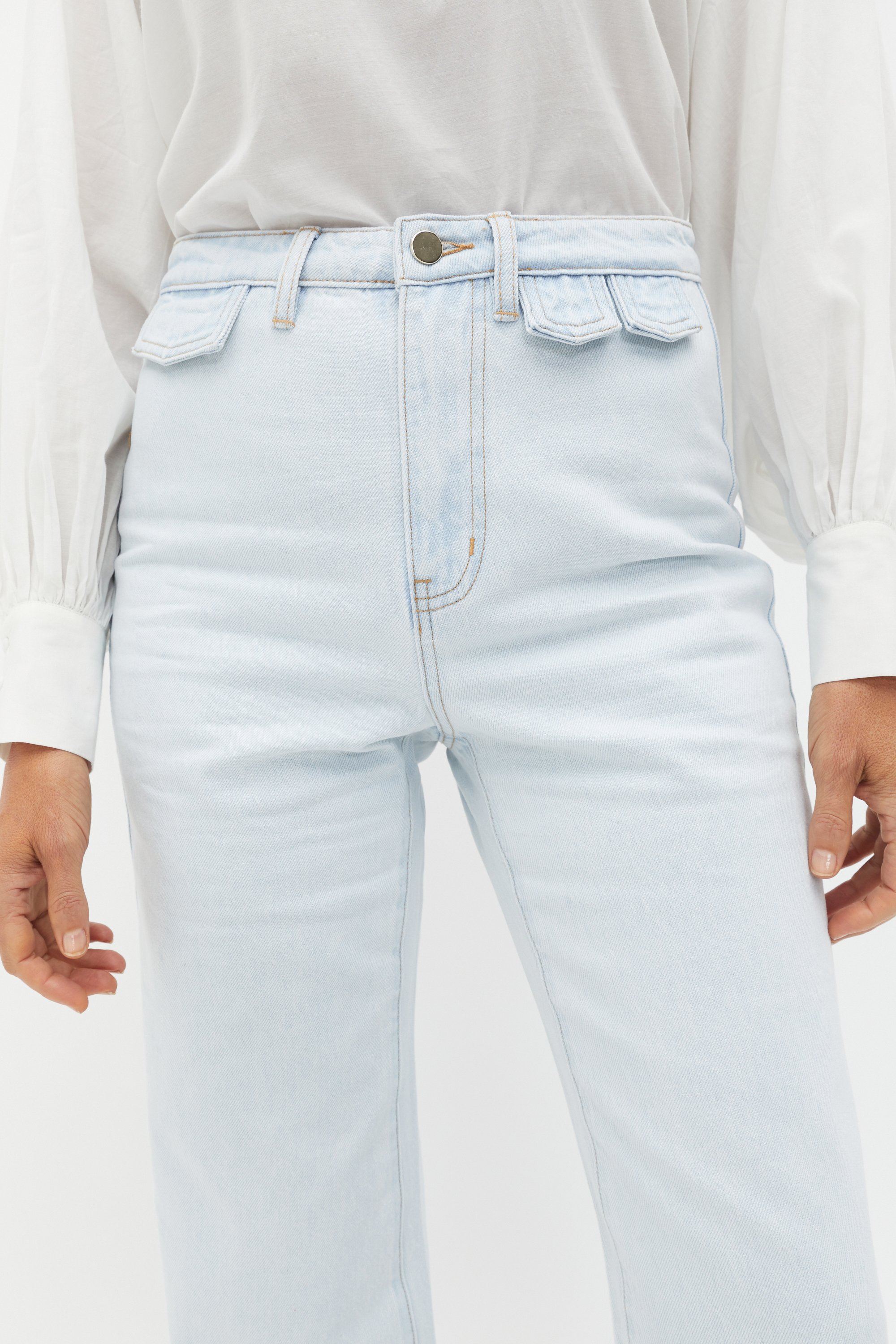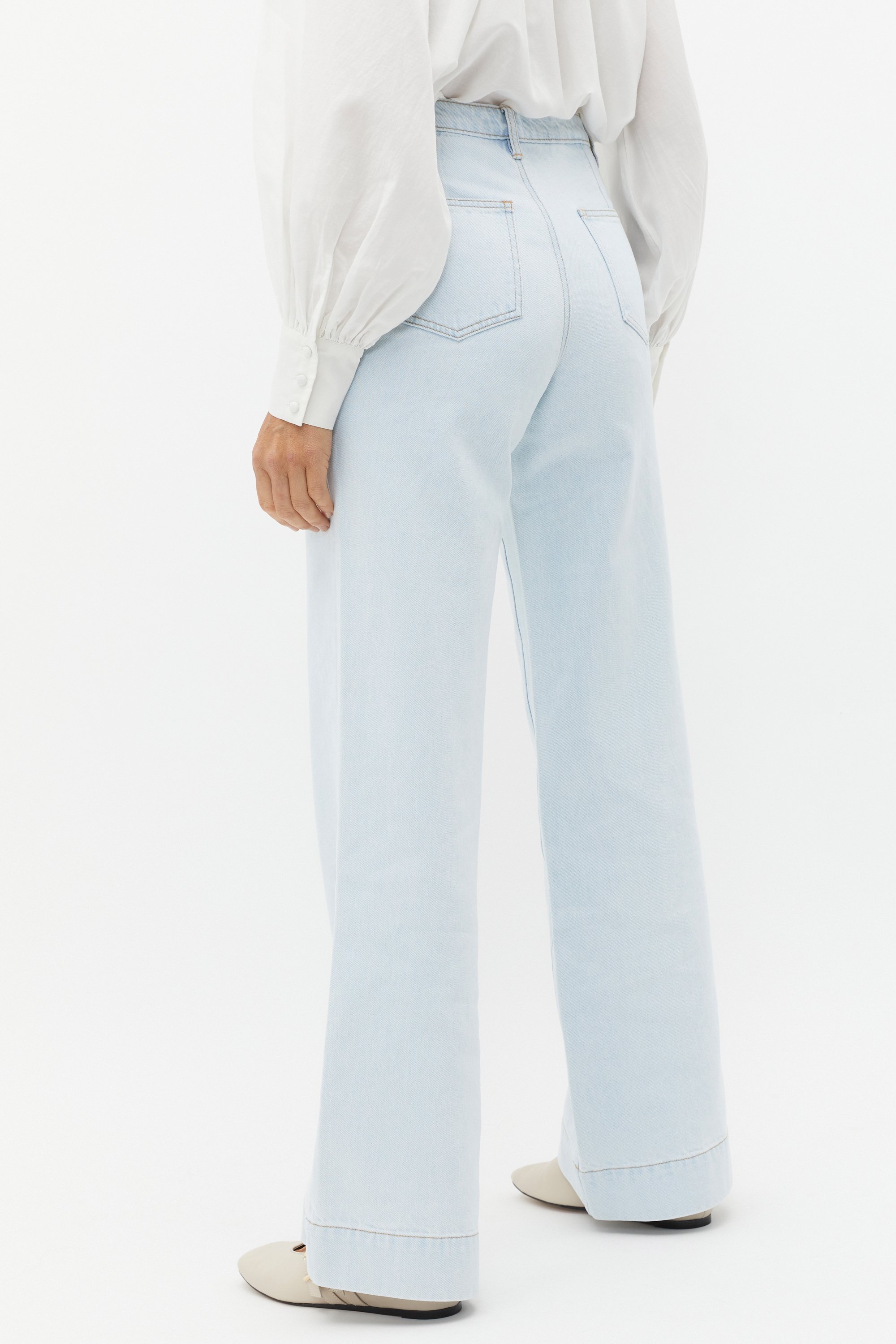 A modern take on a retro style, these jeans are an instant classic and ideal for your transeasonal wardrobe. Crafted in premium cotton, they feature a fixed waistband with a zip front and tab details, belt loops and a wide leg with a subtle flare. By choosing our cotton products you're supporting our investment in Better Cotton's mission. This product was sourced via a system of mass balance and therefore may not contain Better Cotton.