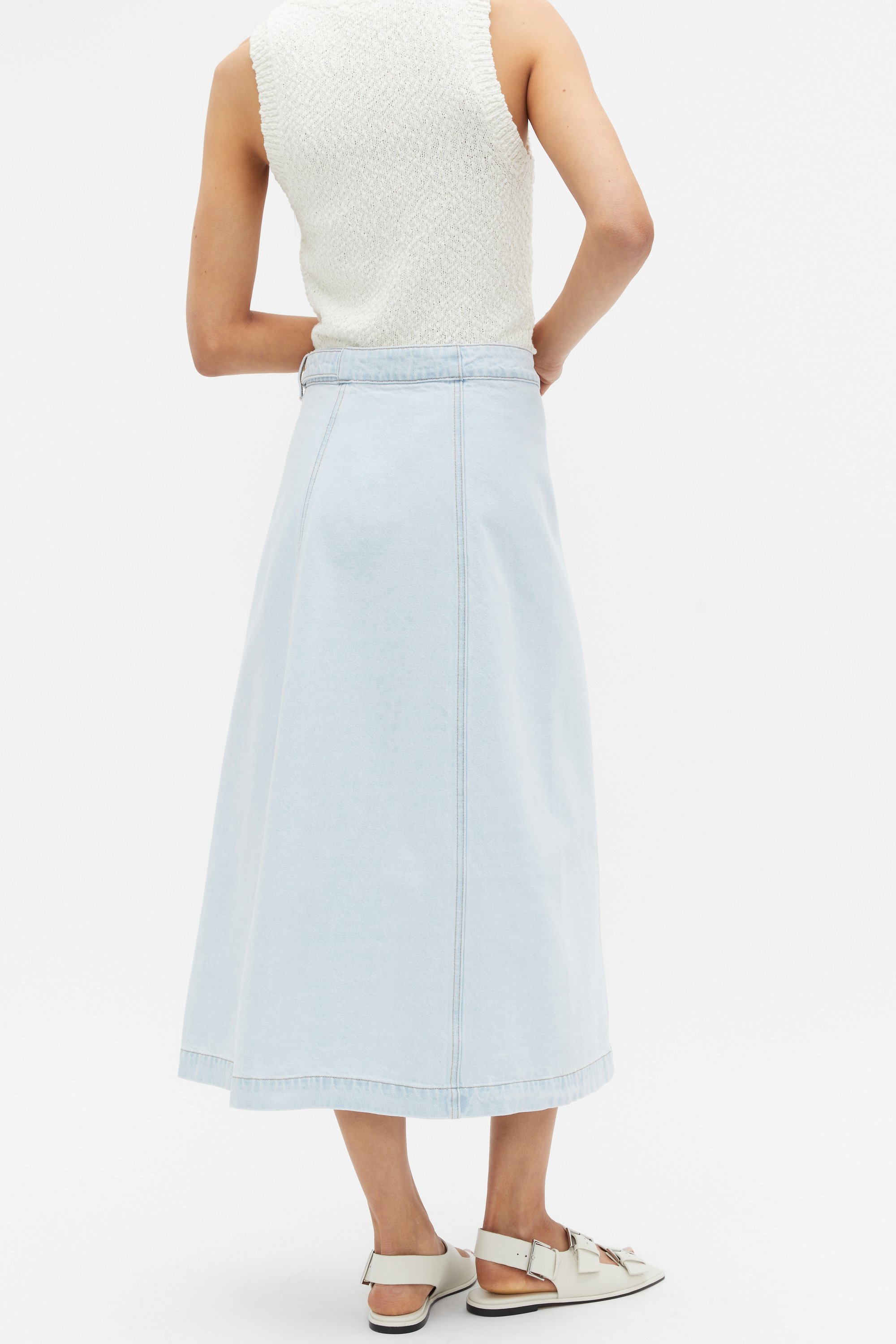 Update your summer styling with this denim skirt, set to become your new go-to. Crafted in premium cotton denim, it features a fixed waistband with a wrap front that secures with a gold tone D ring buckle. By choosing our cotton products you're supporting our investment in Better Cotton's mission. This product was sourced via a system of mass balance and therefore may not contain Better Cotton.