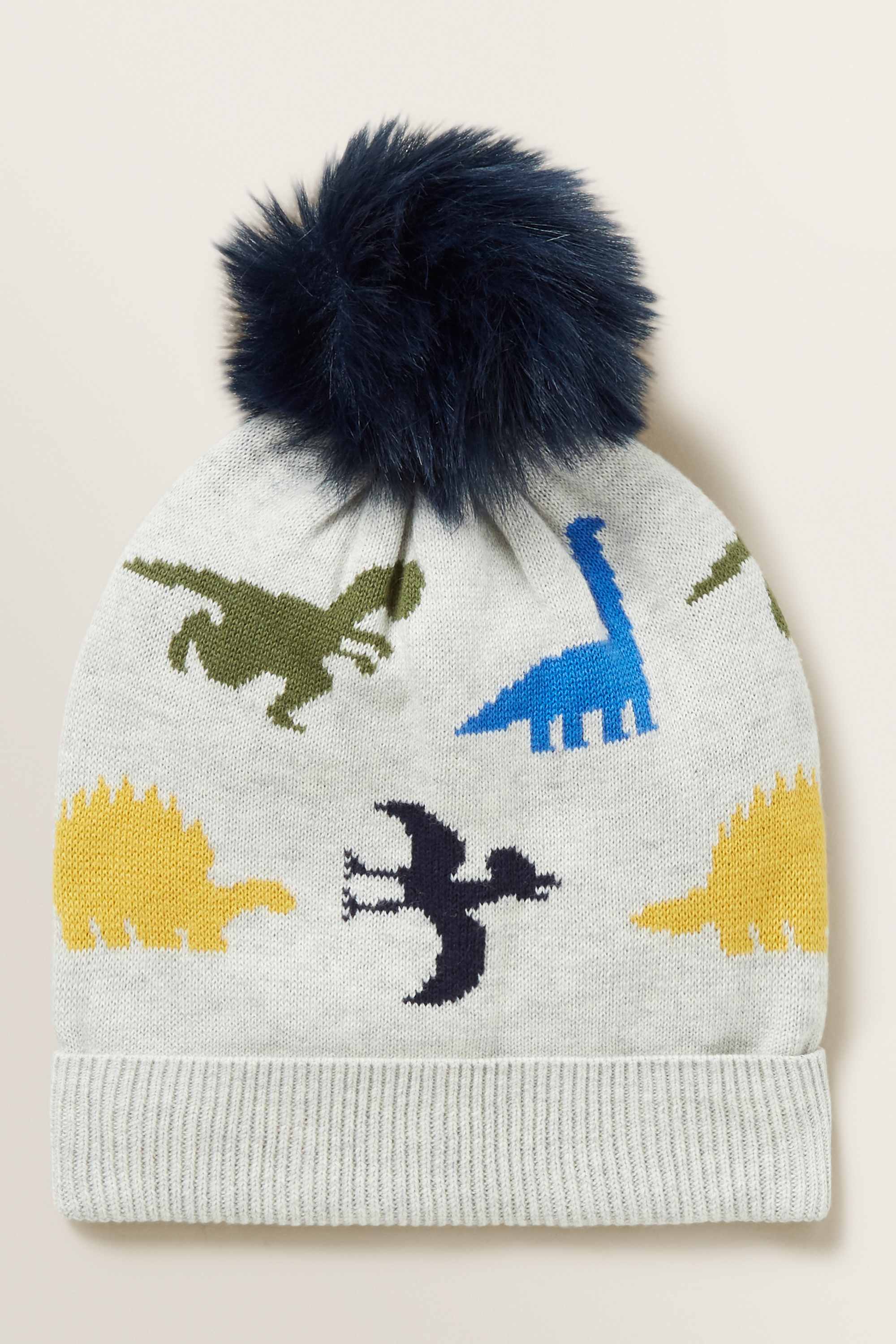 Beat the winter chill, wearing this Dino Beanie. Featuring a dinosaur yardage, this beanie is detailed with an oversized pom pom. Check the label inside of the garment for care instructions.