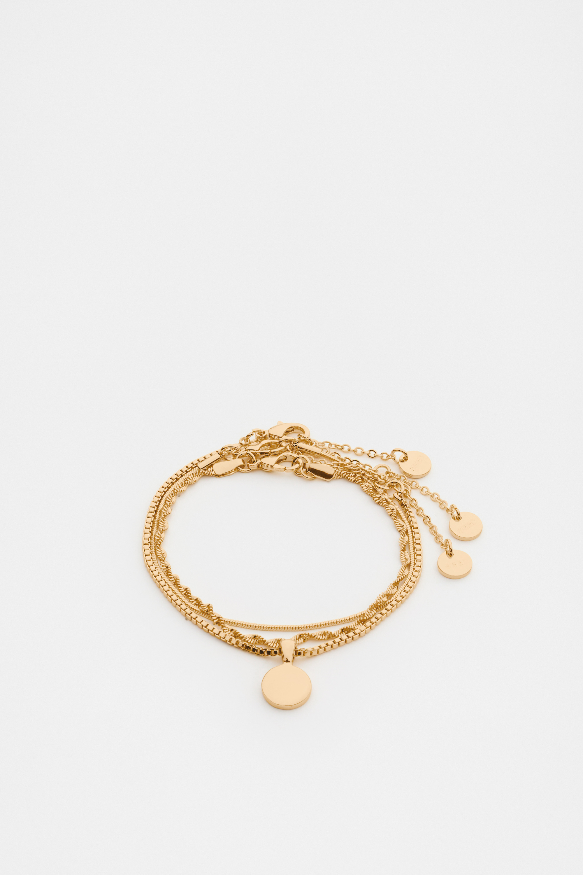 Elevate your head-to-toe styling with this chic stack of bracelets. This design features two adjoined chains and one separate and a small disc pendant.
