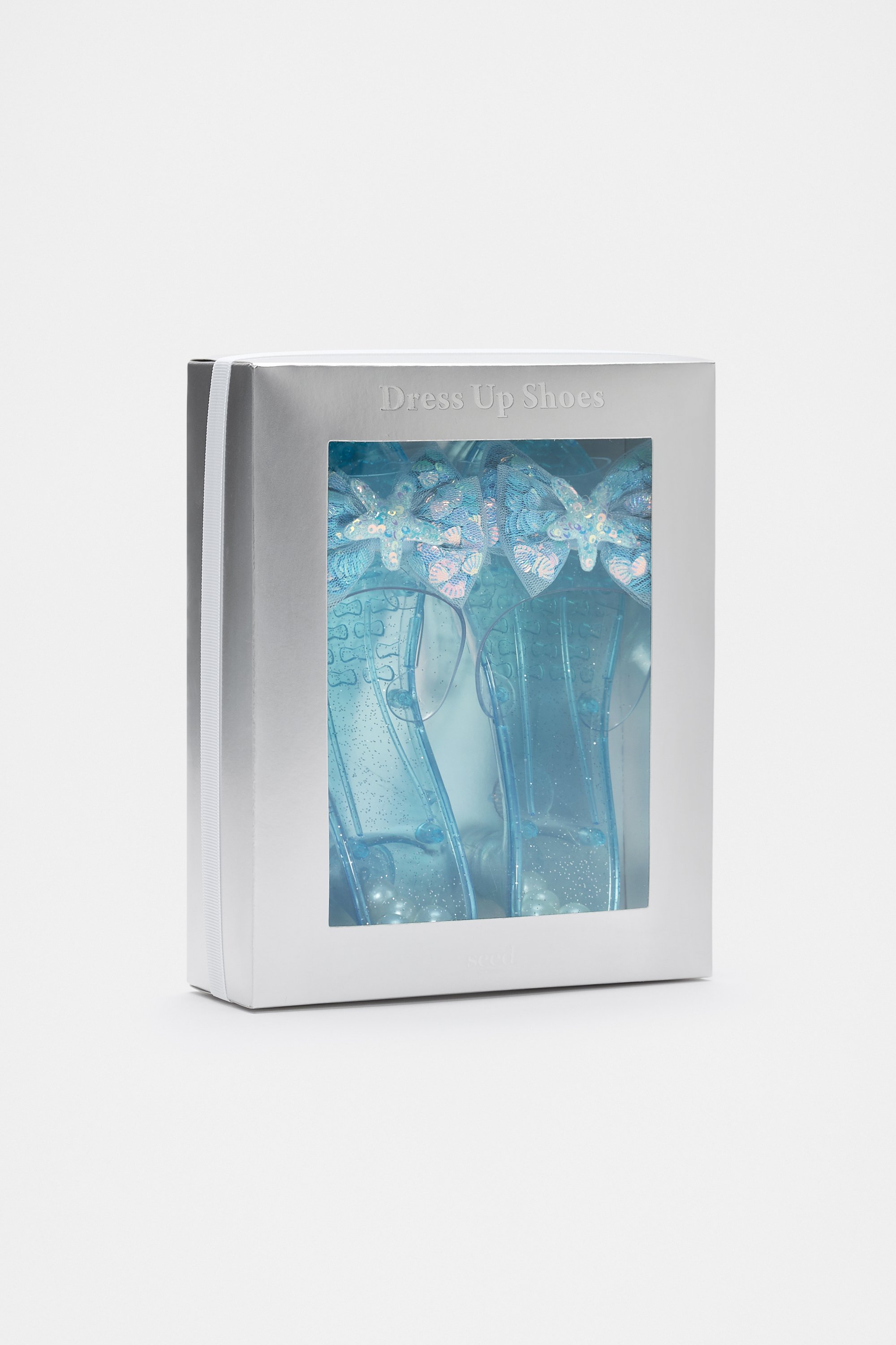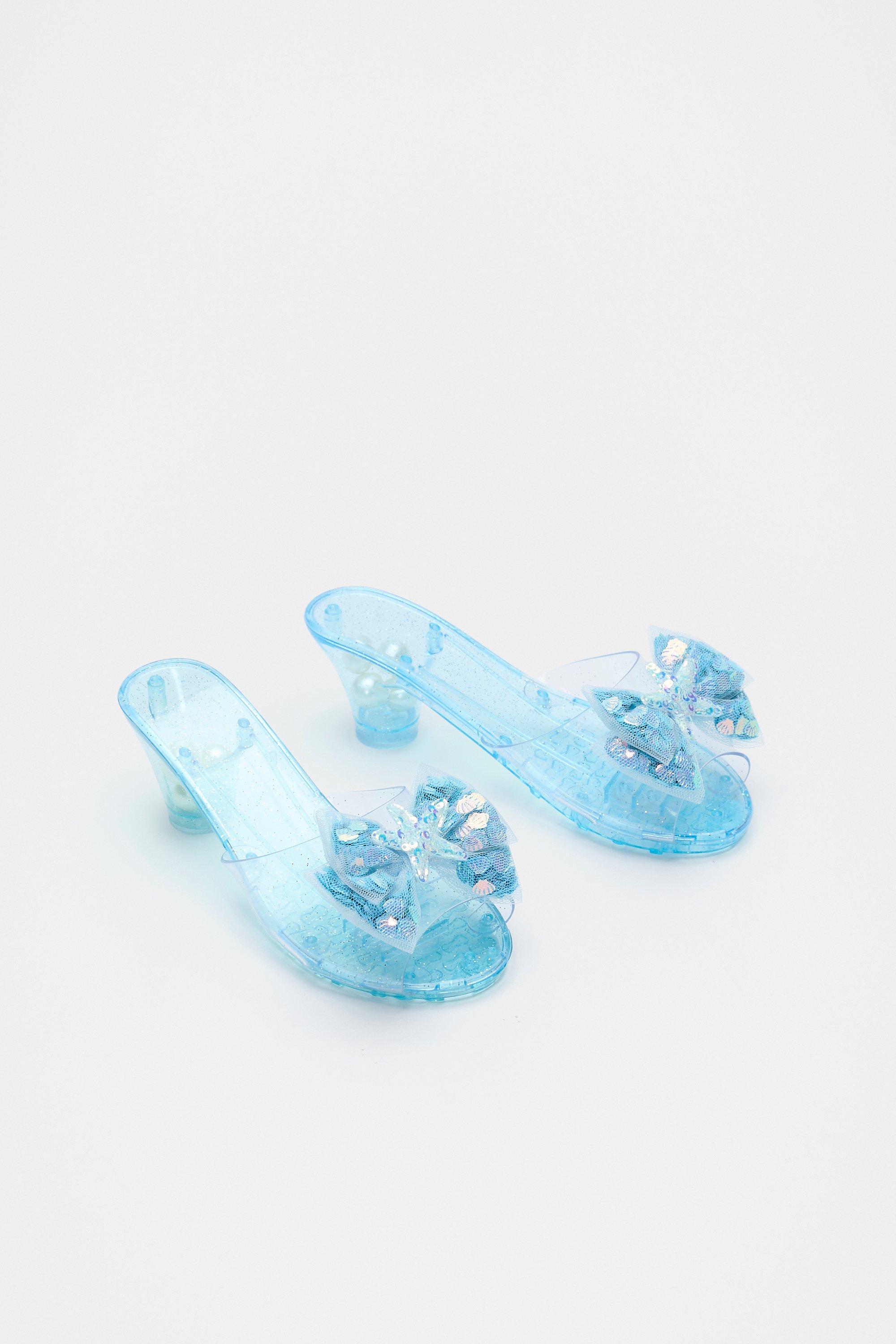 Add a touch of magic to her dress-up box with these playful shoes. They feature bead-filled heels, sparkly starfish bows and an all-over glittery design. For an extra magical touch, complete her dress-up look with the matching mermaid dress-up set or matching mermaid tail. Not recommended for children three years and under, potential choking hazard.