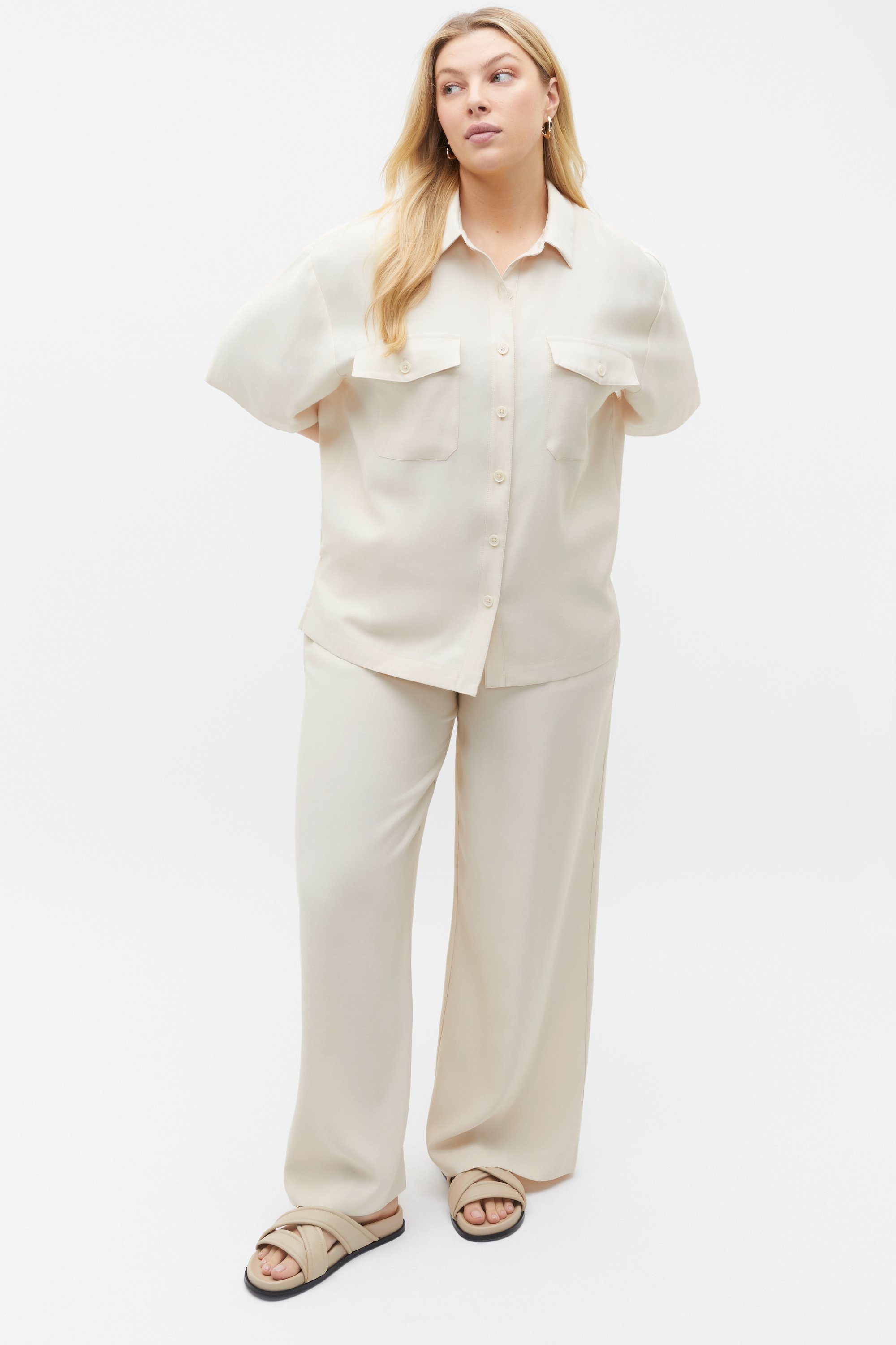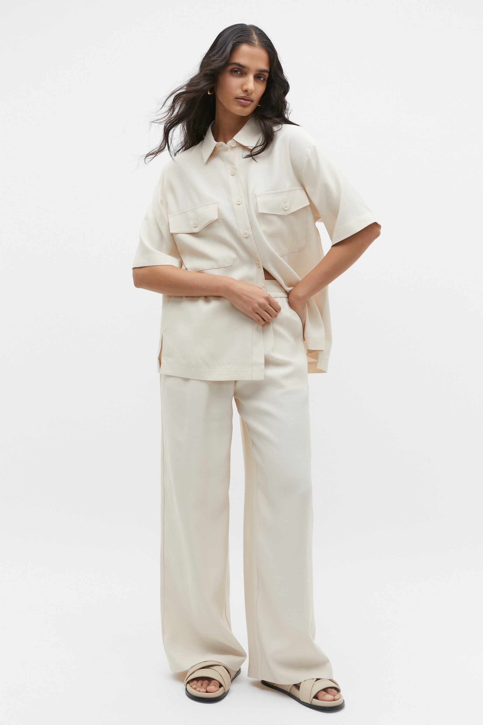 Comfortable and easy to style, these trousers are sure to slot right into your wardrobe. They have an elasticated waistband, angled side pockets, rear welt pockets, and a wide leg shape.