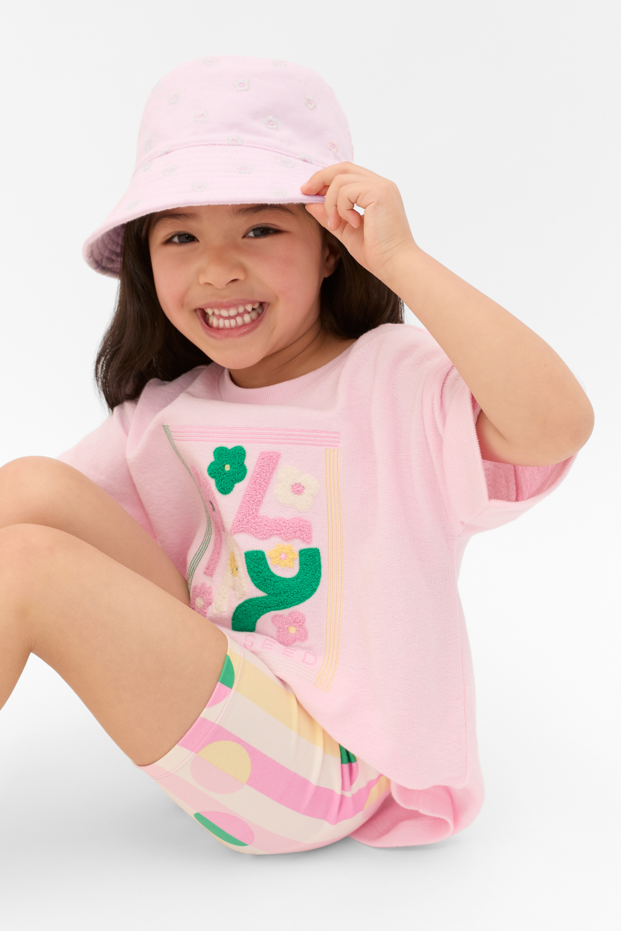 Pretty in pink with an embroidered flower design on each side, this bucket hat is perfect for sunny days.