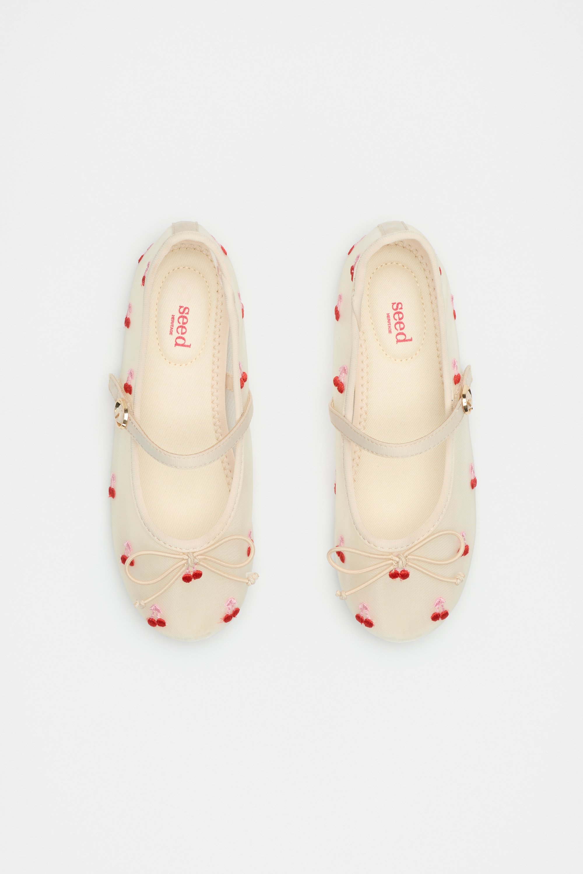 Designed to complement our apparel styles, these ballet flats have the cutest embroidered cherries on a sheer mesh. They fasten with a hook-and-loop strap across the top.