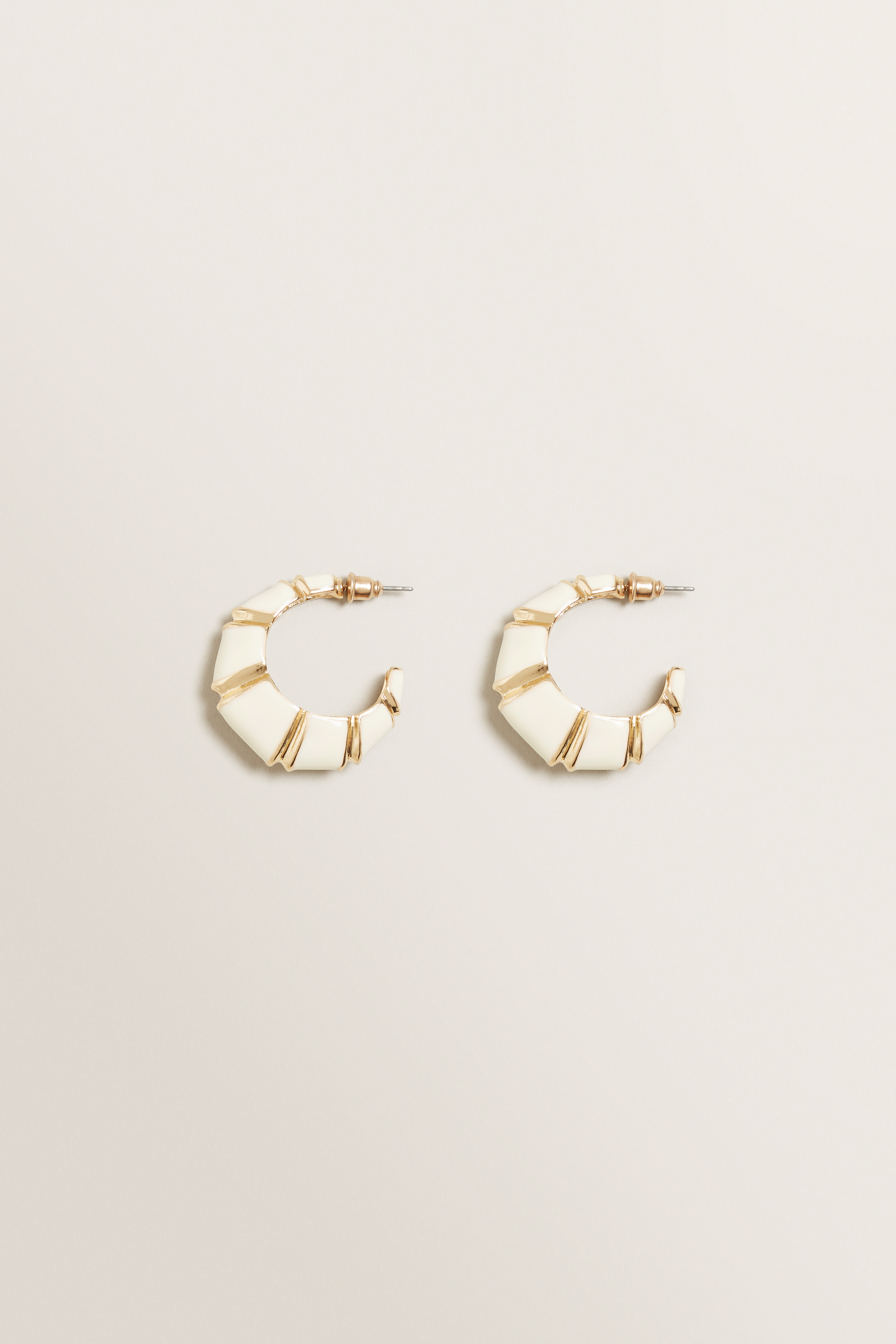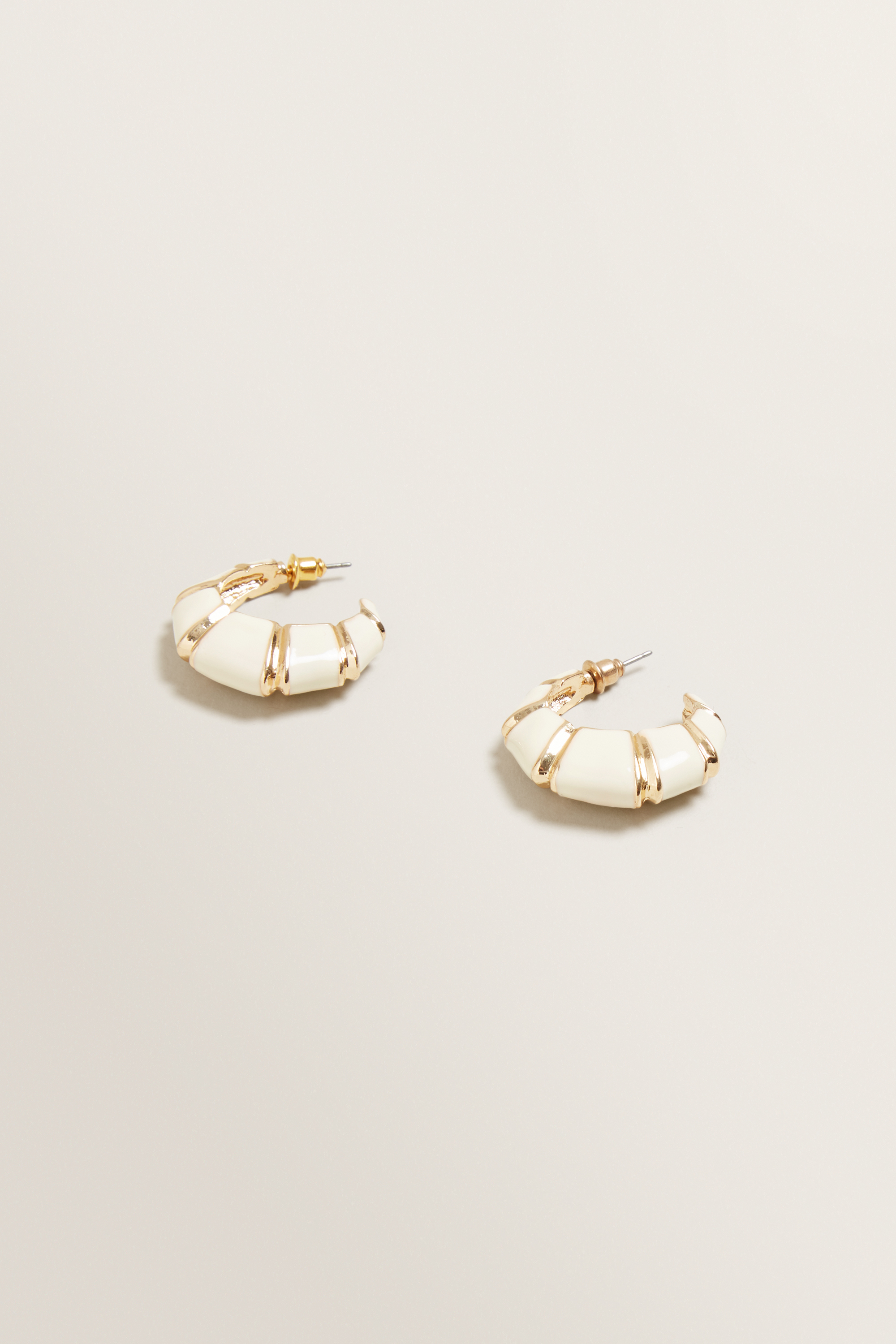 Fall in love with these simply elegant Enamel Hoops. Crafted from a Metal base, these hoops are coated in a Cream and Gold mixed enamel, fitted with surgical steel posts.