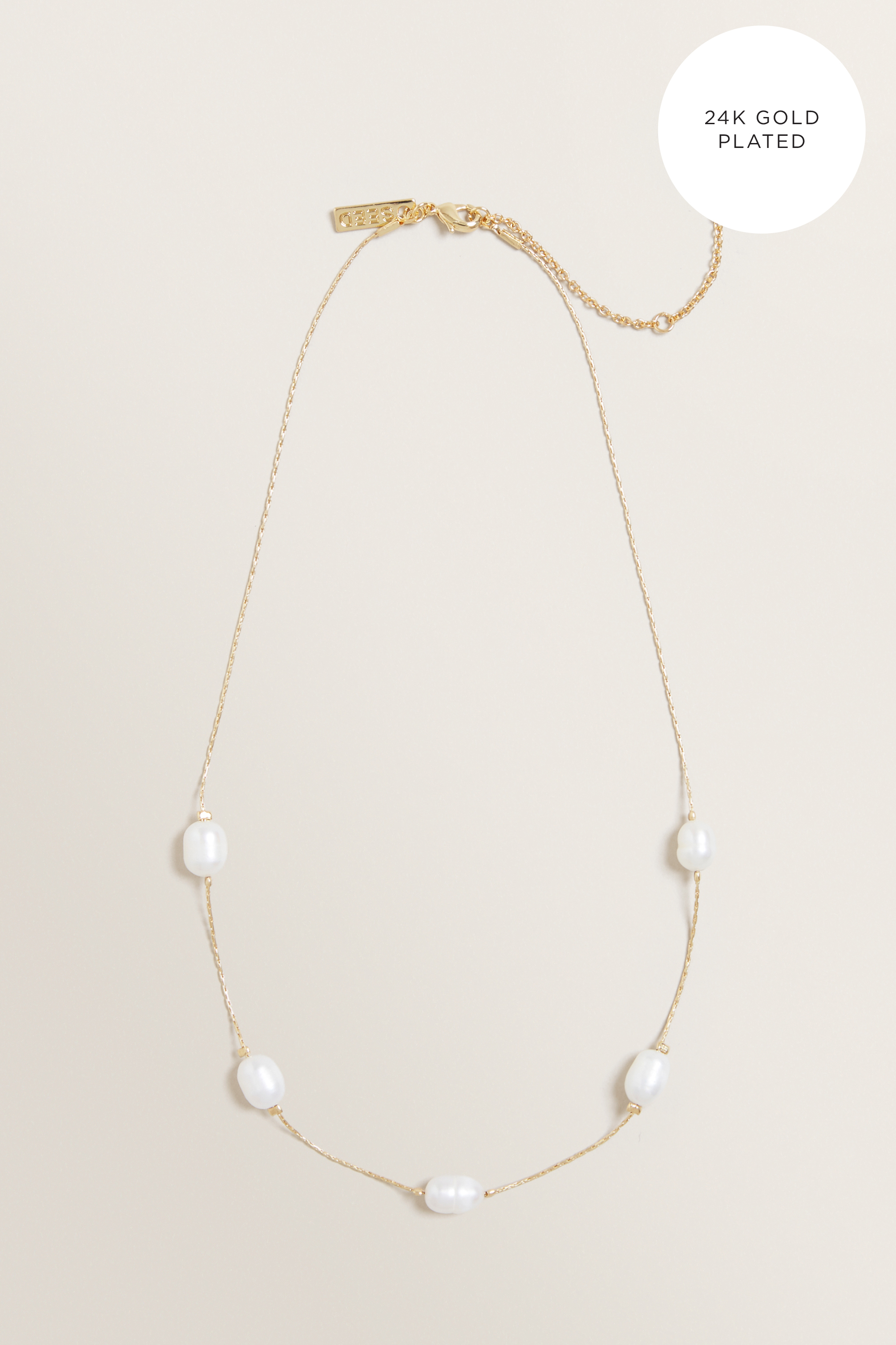 Introduce a delicate element to your Seed rotation, with this 24K plated collection. This Fine Multi Pearl Necklace is detailed with stunning freshwater pearls, adjustable chain and latch closure.