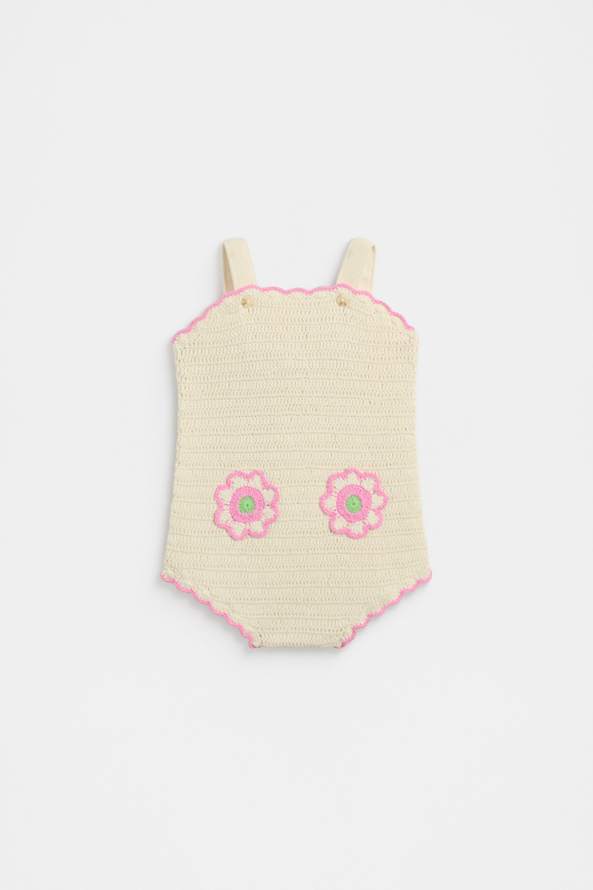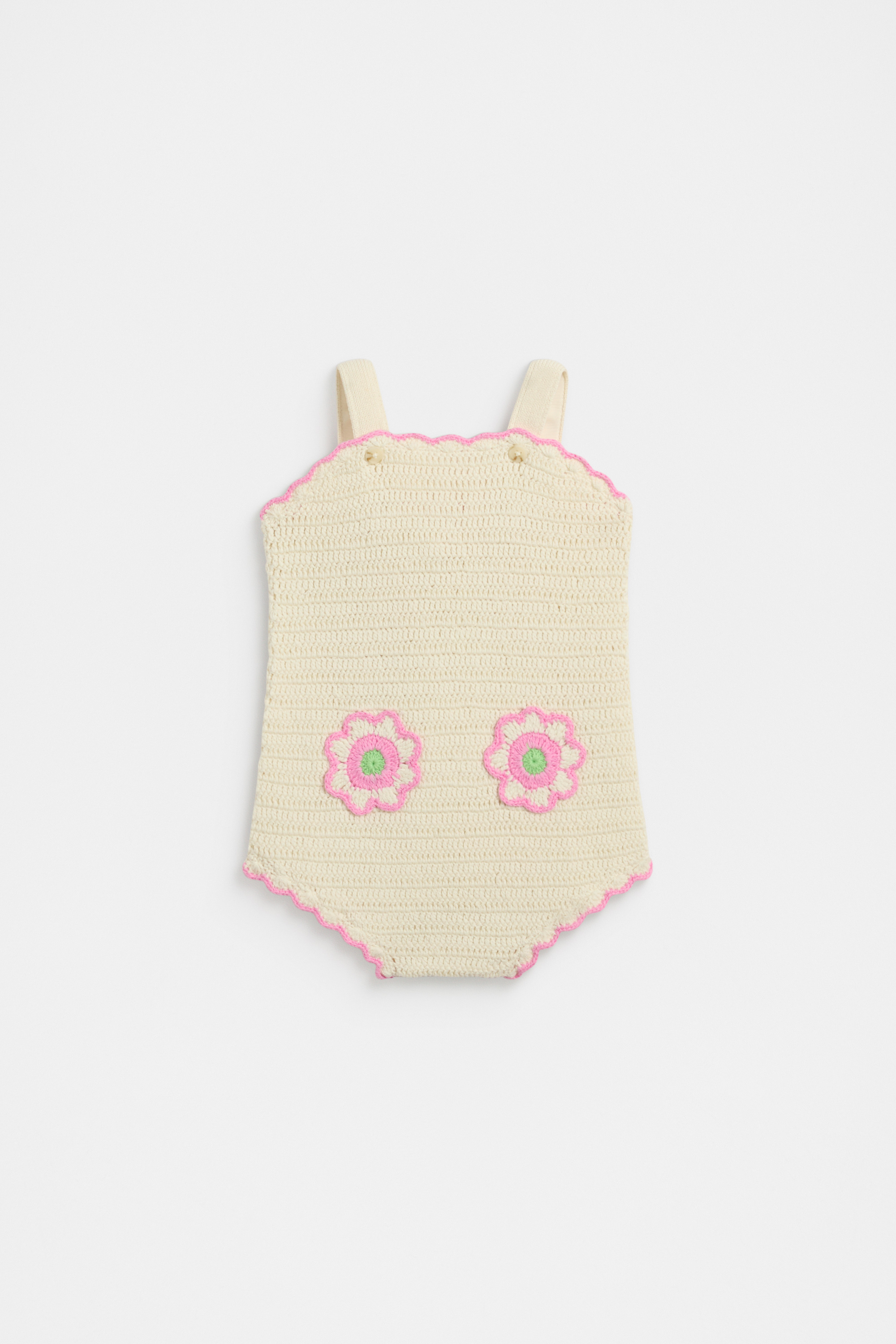 Adding cheer to her summer wardrobe, this romper is finished in an adorable crochet knit. Crafted in premium cotton, it features a scallop trim detail, flower pockets and buttons at the gusset for easy changes.
