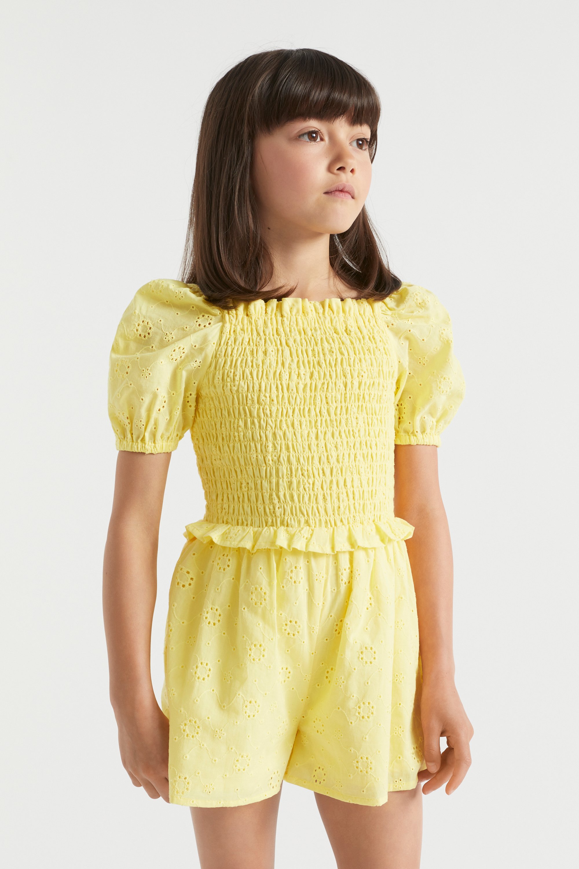 This playsuit is covered in delicate flowers, printed onto pure cotton. The bodice is shirred for comfort, with delicate frills running along the waistline and puff sleeves. The shorts have a relaxed fit, and feature curved pockets at the front.