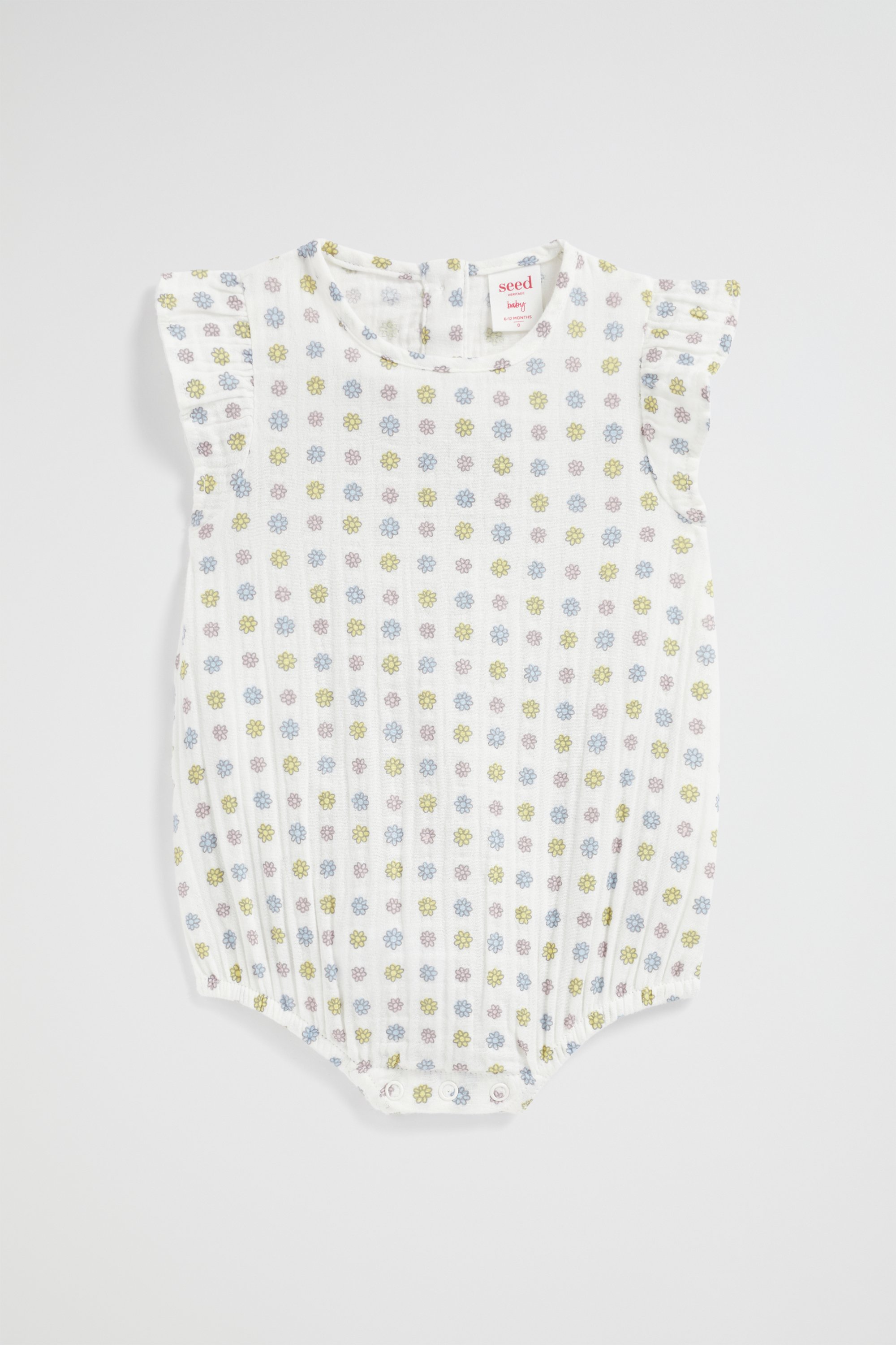 Printed with a fun floral pattern, this soft and comfy romper is crafted from 100% cotton and features frill details the sleeves. The romper has a round neckline and snap fastenings along the gusset for easy changing.