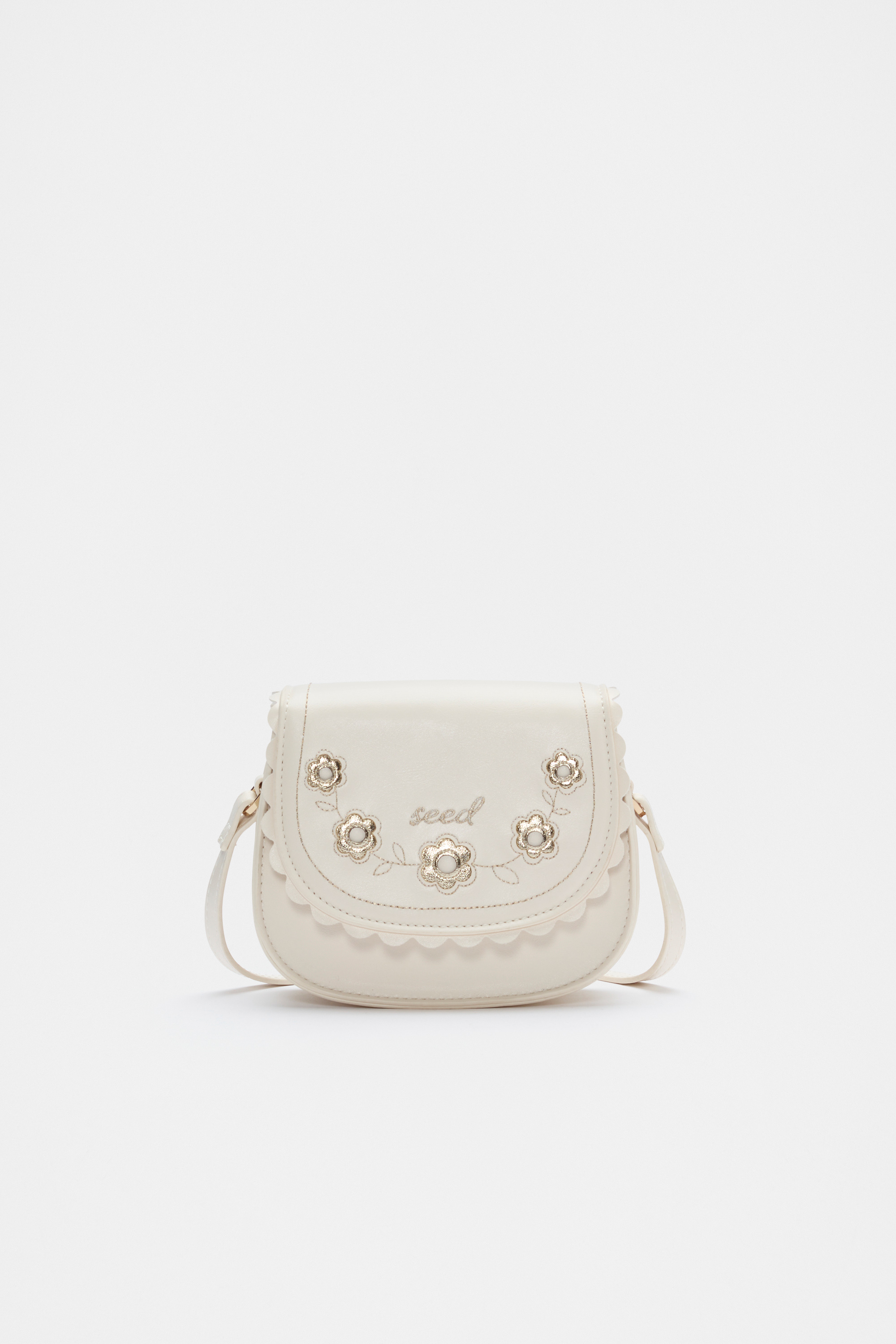 The perfect gift, this adorable saddle bag is detailed with chic embroidered flowers with a metallic finish. It features a magnetic flap closure and a crossbody strap.