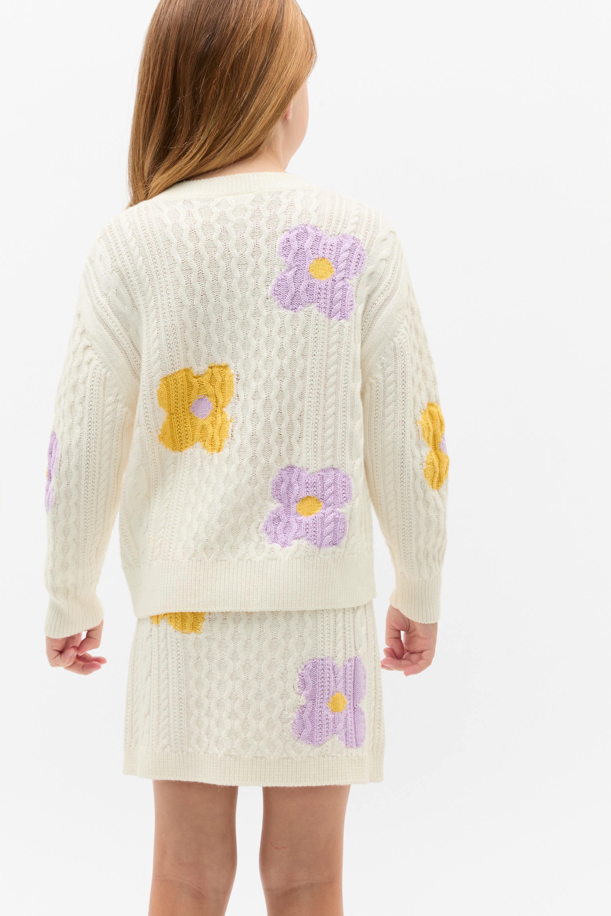 A cheerful style all covered in flowers, this cardigan features a round neck, long sleeves, a button front and a cable knit finish. Style with the matching pants, skirts or accessories for the sweetest ensemble.