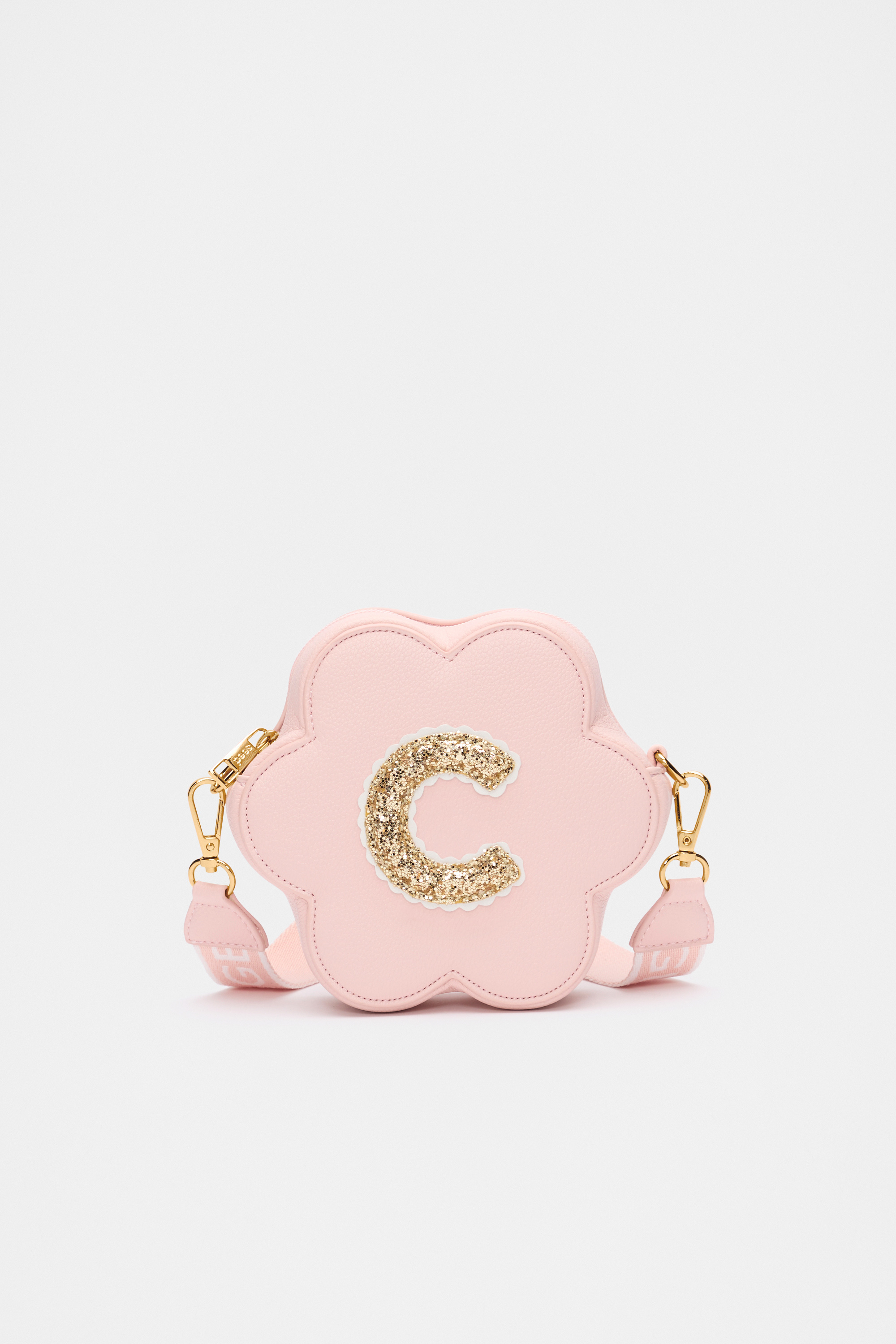 Stylish, fun, and personalised, this flower-shaped bag features a detachable crossbody strap with logo details, a top zip closure, gold-look hardware, and a glitter initial on the front. It also has a flower charm on the strap.