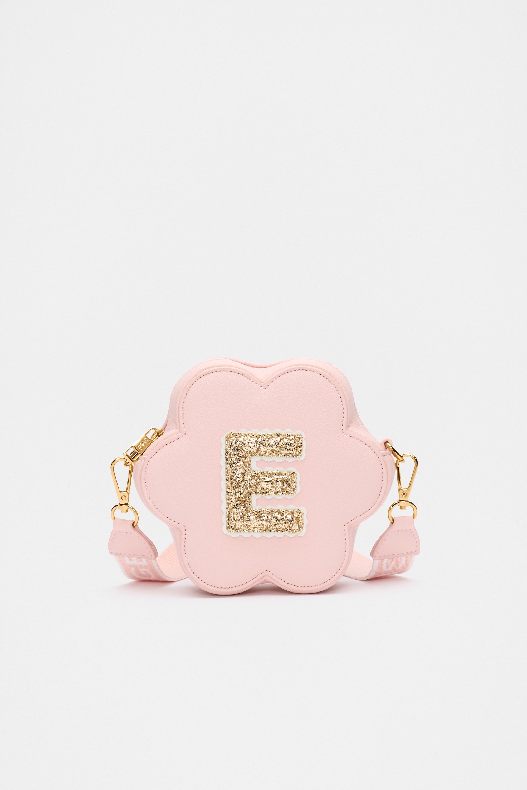 Stylish, fun, and personalised, this flower-shaped bag features a detachable crossbody strap with logo details, a top zip closure, gold-look hardware, and a glitter initial on the front. It also has a flower charm on the strap.