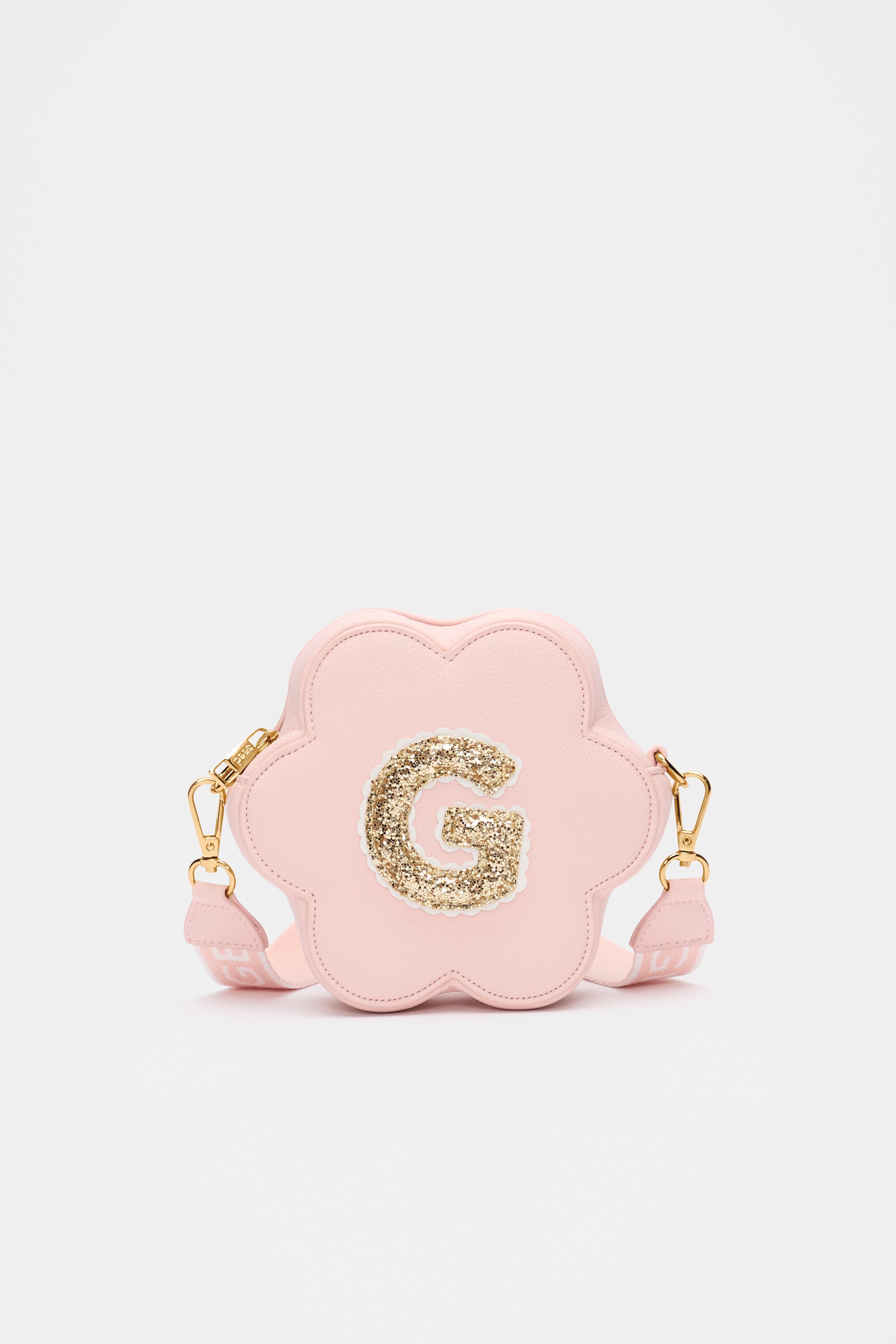 Stylish, fun, and personalised, this flower-shaped bag features a detachable crossbody strap with logo details, a top zip closure, gold-look hardware, and a glitter initial on the front. It also has a flower charm on the strap.