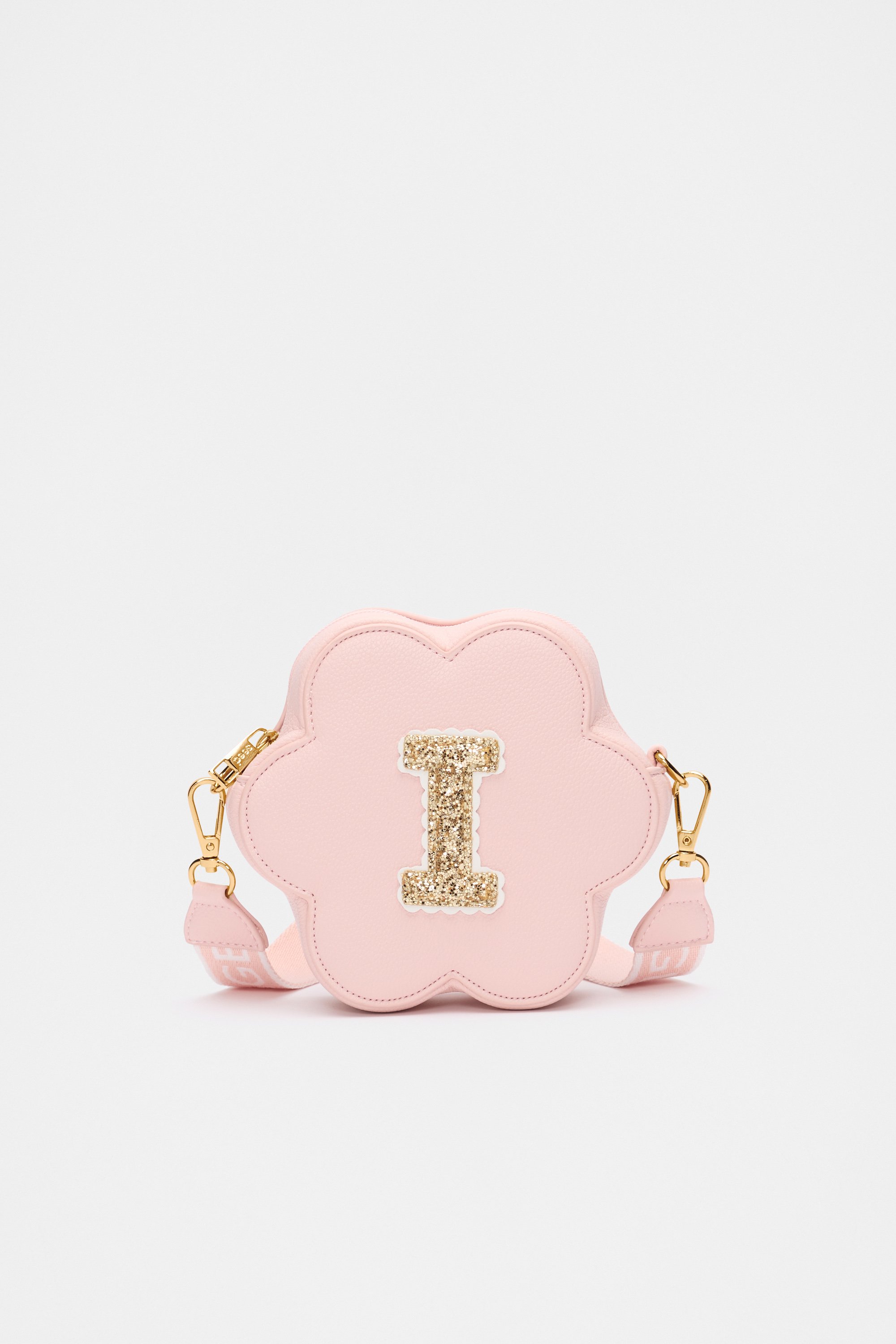 Stylish, fun, and personalised, this flower-shaped bag features a detachable crossbody strap with logo details, a top zip closure, gold-look hardware, and a glitter initial on the front. It also has a flower charm on the strap.
