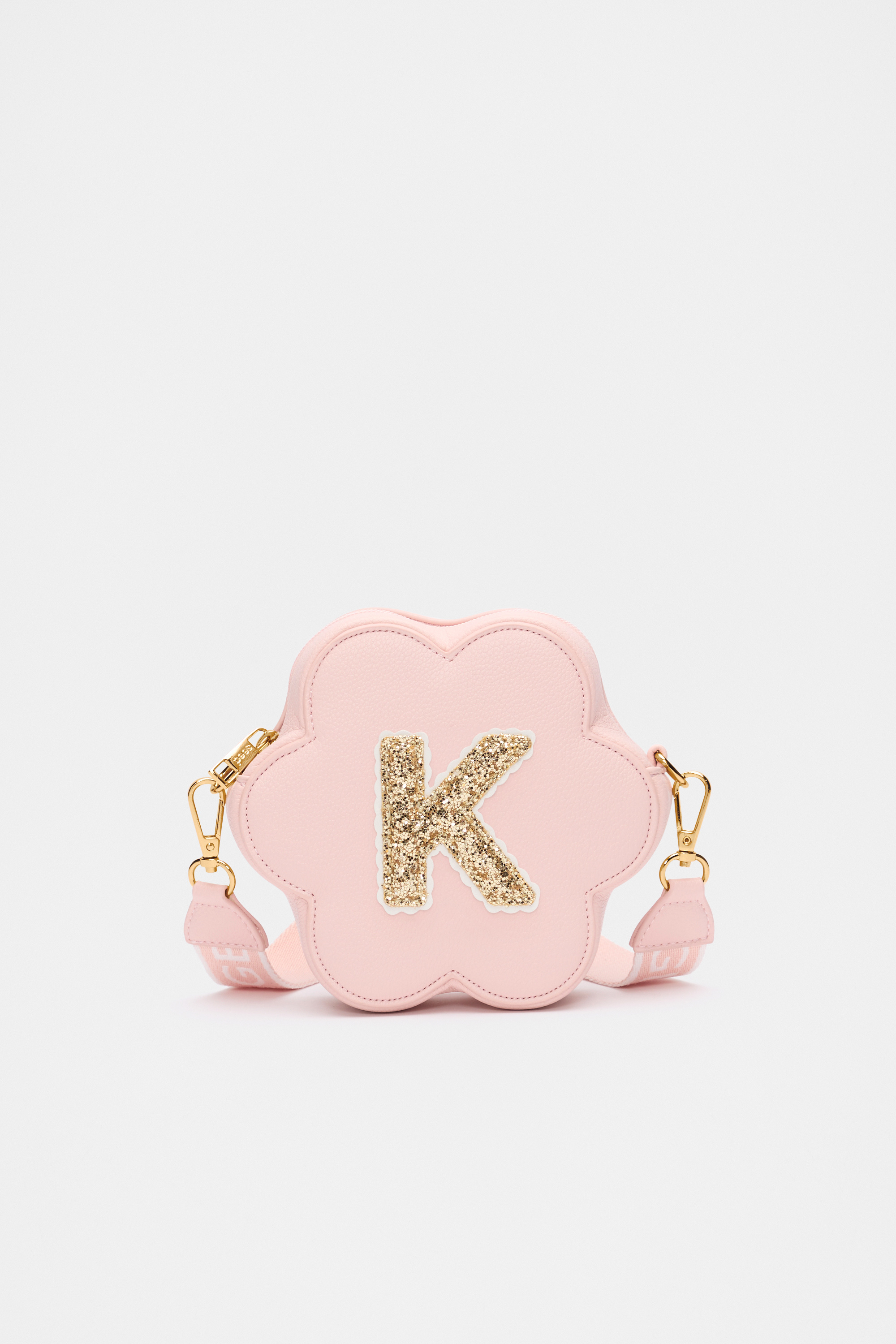 Stylish, fun, and personalised, this flower-shaped bag features a detachable crossbody strap with logo details, a top zip closure, gold-look hardware, and a glitter initial on the front. It also has a flower charm on the strap.