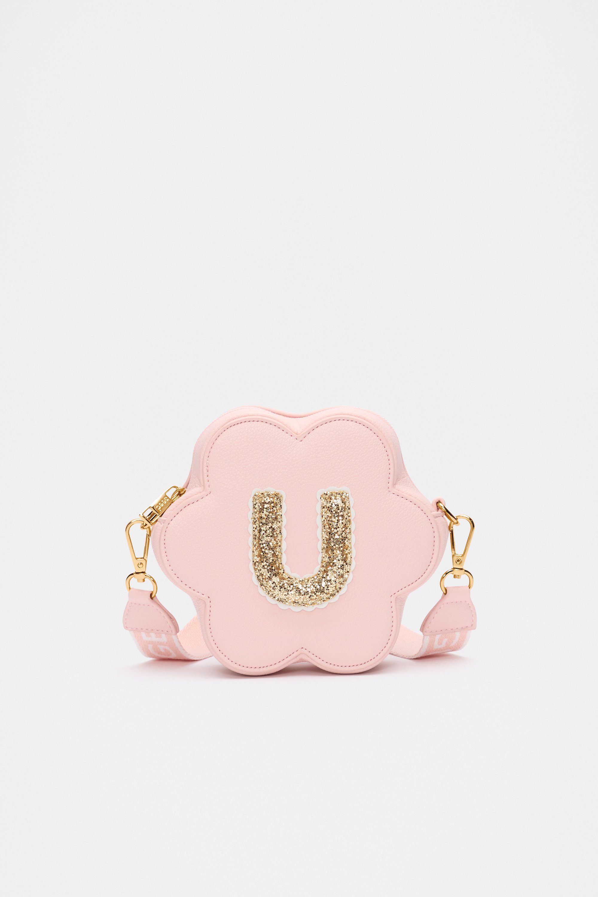 Stylish, fun, and personalised, this flower-shaped bag features a detachable crossbody strap with logo details, a top zip closure, gold-look hardware, and a glitter initial on the front. It also has a flower charm on the strap.