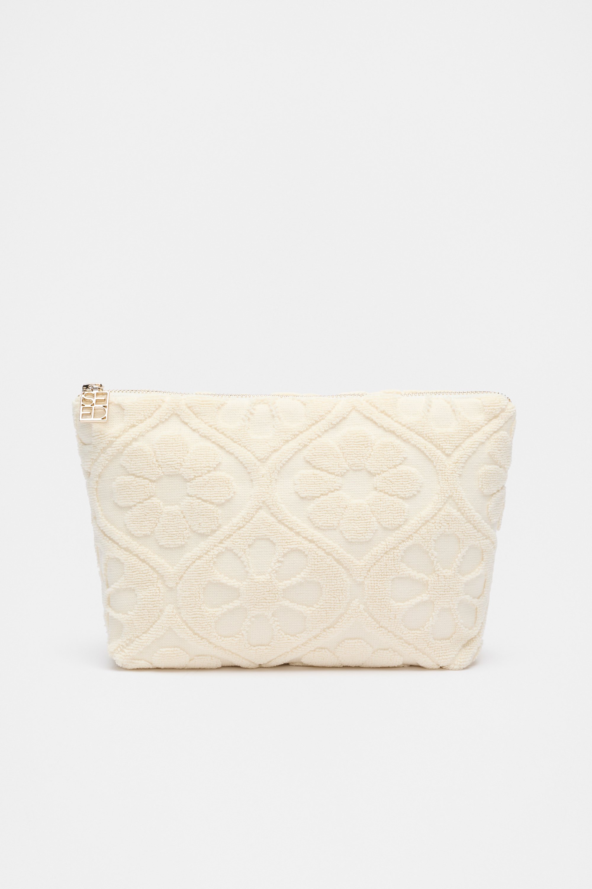 Stylish and convenient, this little pouch is finished in a textured toweling with a floral pattern. Crafted in premium cotton, it features a top zip closure and is designed to pair with the coordinating robe and towel for a poolside set with a luxury feel.