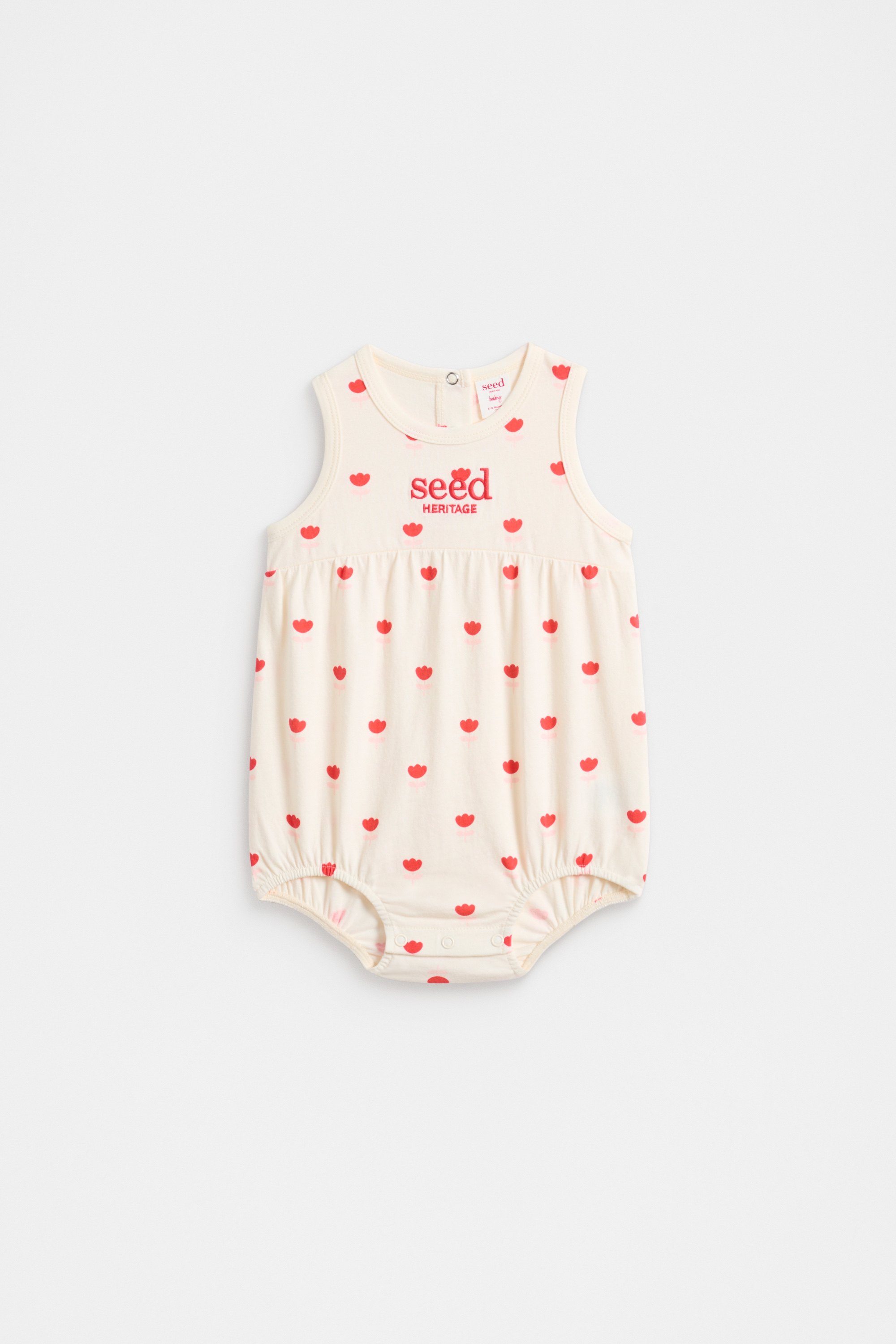 Lightweight, cute and perfect for summer, this little romper has the sweetest design of flowers. Crafted in premium cotton, it features a tank-style top with a round neck, elasticated leg openings and fastens at the back of the neck and at the gusset with snap buttons.