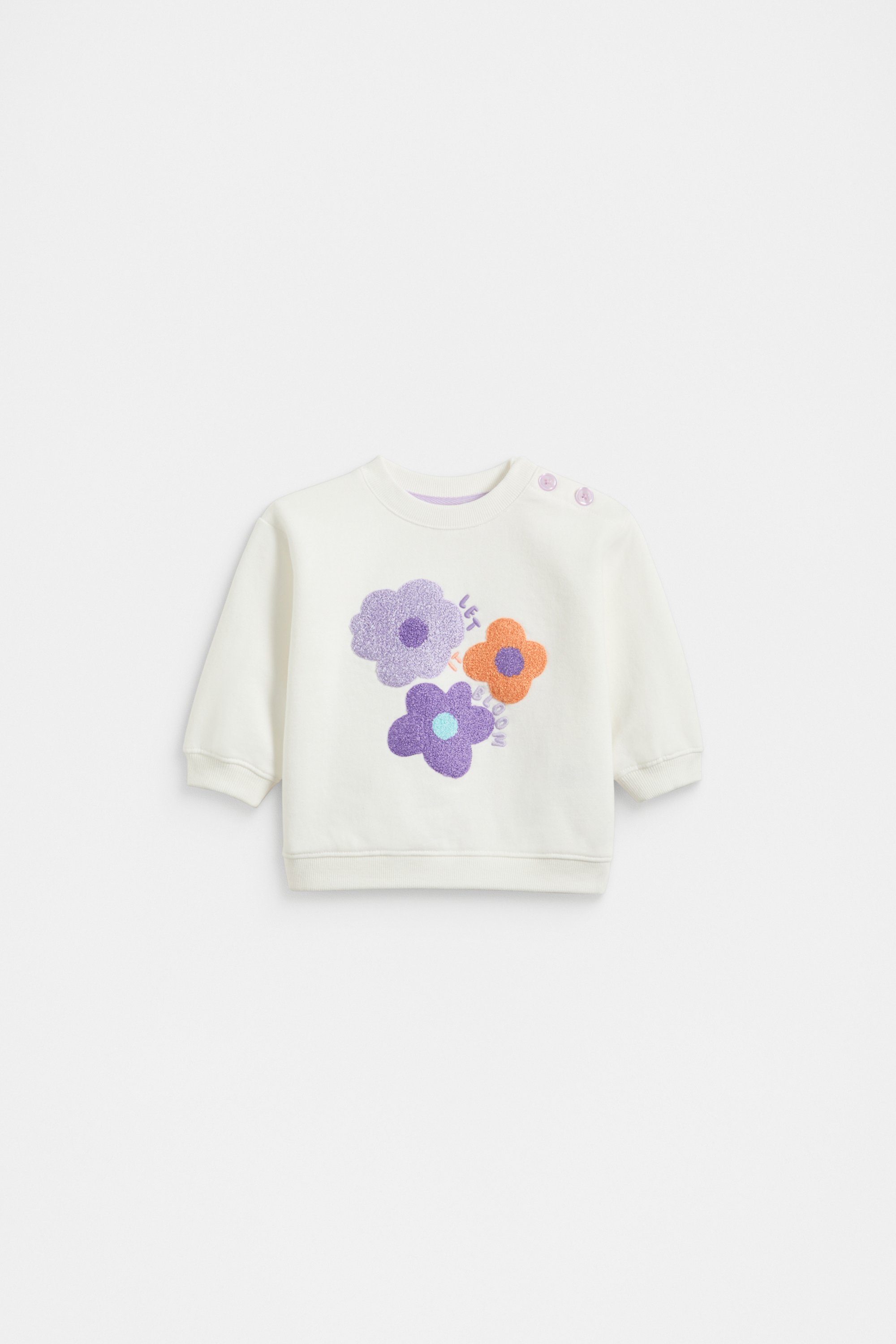 Detailed with adorable chenille patch flowers, this little jumper is sure to become a new favourite in her wardrobe. Crafted in premium cotton, it's soft to the touch and features a round neck, long sleeves and ribbed detailing at the cuffs and trim.