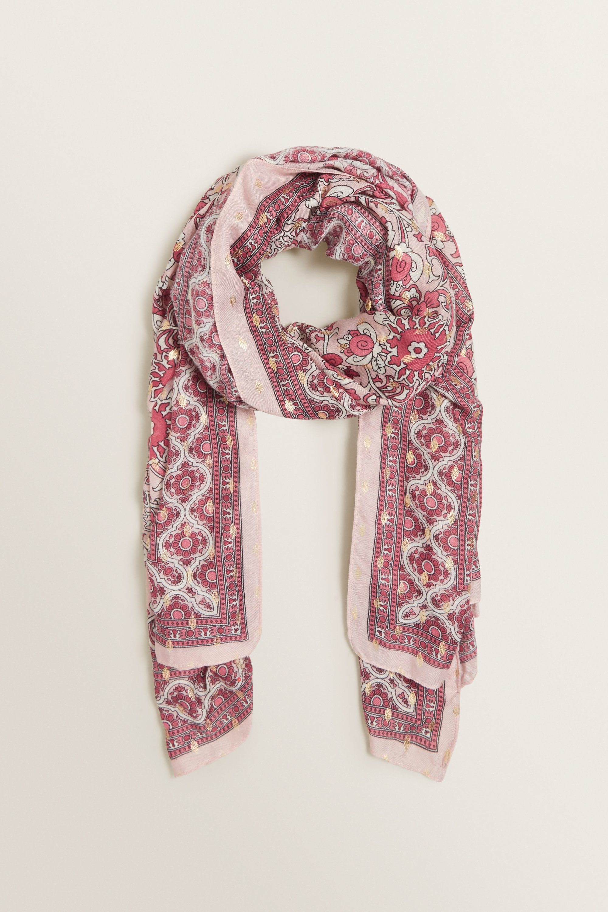 Crafted from a gauzy blend, this Folk Floral Scarf is accented with a foil emboss.
