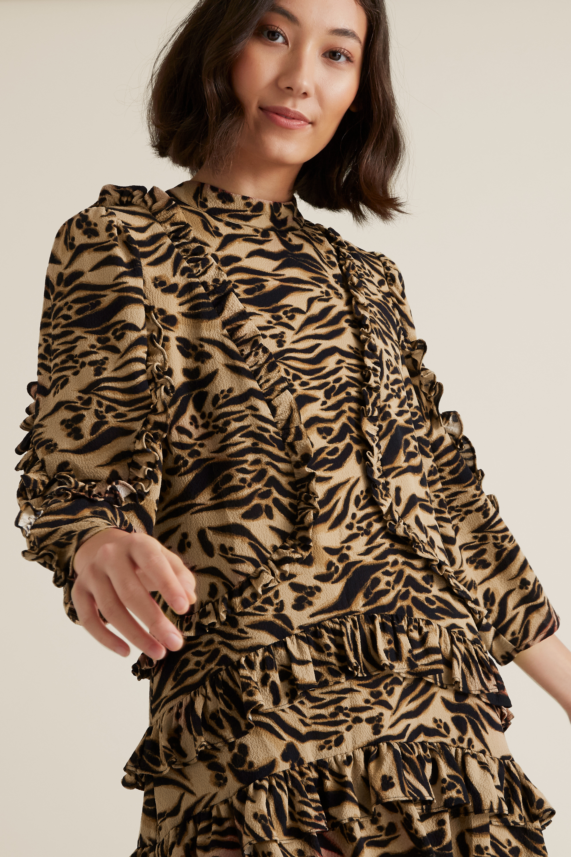Summer outfitting is made simple, with this Frill Animal Dress. Sporting a bold yardage animal print, this dress is crafted from a Polyester/Elastane blend. It boasts elegance with frill trims and flowy sleeves, detailed with a high neckline, long sleeves, dropped waistline, invisible back zip up closure and tiered skirt. Available in sizes 6 to 16, our model is 176 cm and wears a size 8. For care information, check the label inside of the garment.