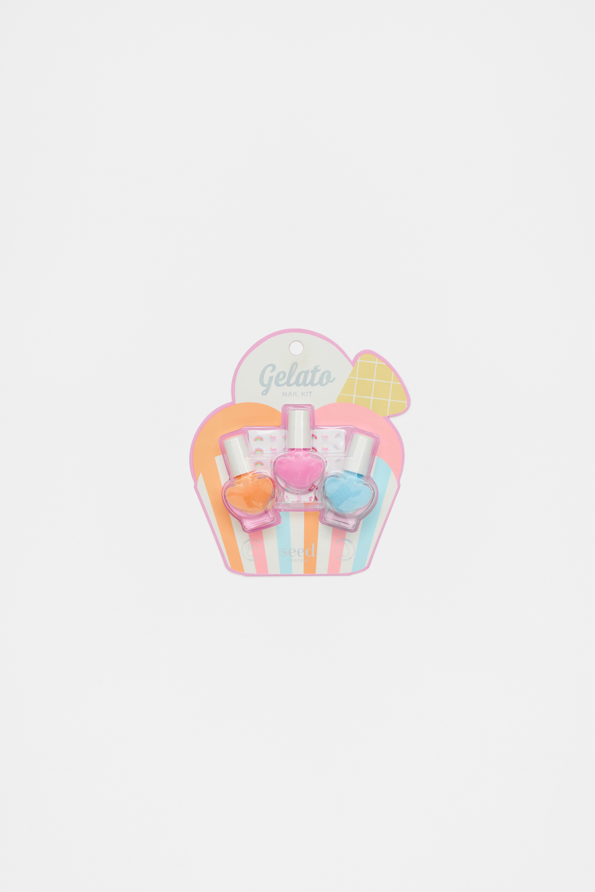 Perfect for at-home makeovers, this nail kit includes three water-based nail polishes and a sheet of nail stickers in a too-cute gelato design. This product is not a toy and is not suitable for children three years and under.