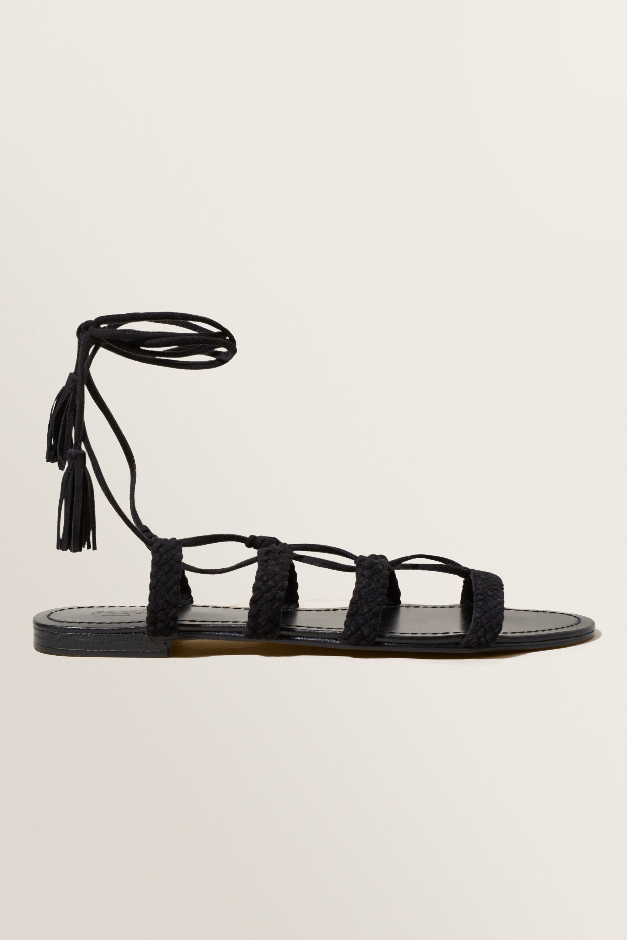 The quintessential summer shoe, these gladiator sandals feature braided straps crossing the foot, woven together by a corded tie that wraps around the ankle. The cord is finished with tassels, and can be worn a variety of ways for a versatile look.